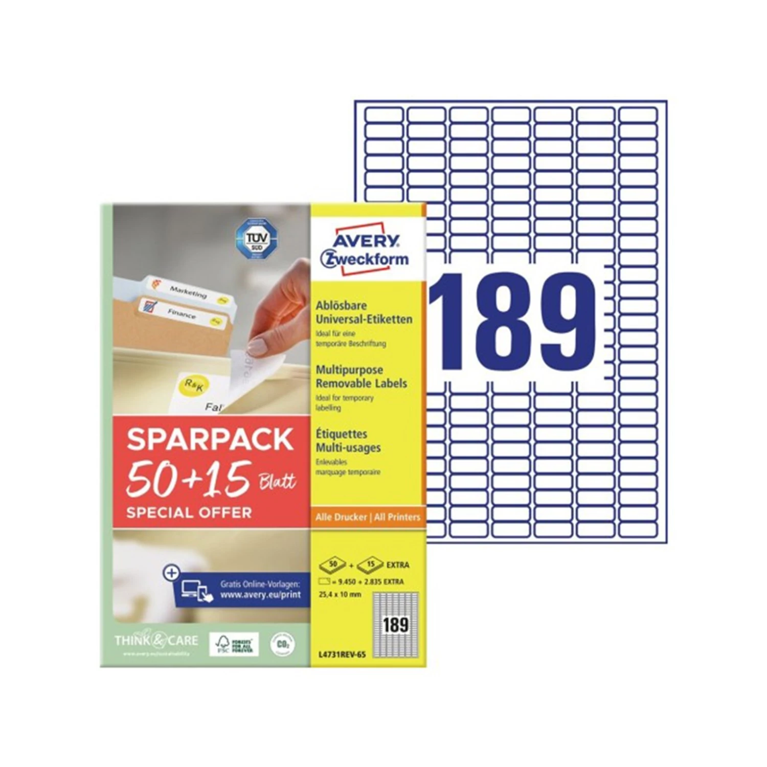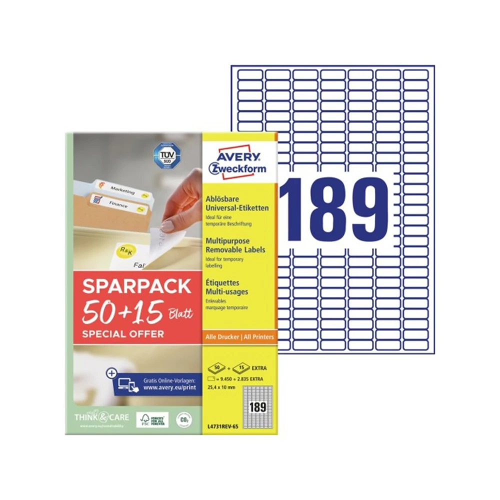 Etikett címke, 25,4x10mm, univerzális, 65 lap, 189 címke/lap Avery, fehér