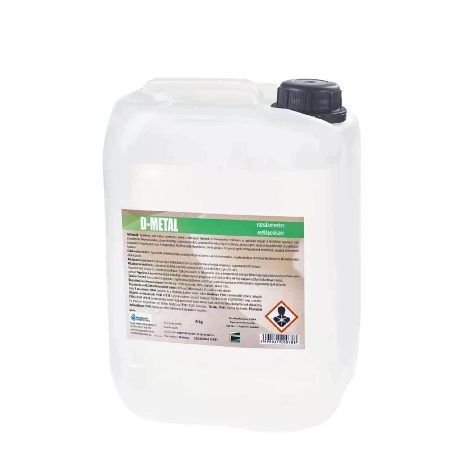 Nemesacél felületek és készülékek védelmére, ápolására és polírozására szolgál. A fémfelület a szer használata után egyenletesen fényes, tiszta lesz, eltávolítja az ujjlenyomatokat, az elszíneződéseket, a lúg és víz okozta csíkokat. A csuklókat és zsanérokat mozgathatóvá teszi. A megtisztított felületen védőréteget képez, amely gátolja a zsír, por, és egyéb szennyeződések lerakódását, egyúttal vízlepergető hatású is. Alkalmazható élelmiszeripari, nagykonyhai és vendéglátóipari nemesacél felületeken és berendezéseken. GHS piktogram: Figyelmeztetés: Veszély Figyelmeztető mondatok: H304 Lenyelve és a légutakba kerülve halálos lehet Kiszerelés 4 kg / kanna Acélápoló rozsdamentes D-Metal 4 kg termék alkalmazásakor ügyeljen a biztonságra! Használat előtt mindig olvassa el a címkét és a használati útmutatót! Katalóguskód: 59197 Hiteles tájékoztatás: Elkötelezettek vagyunk termékeink biztonságának garantálásáért, nyomon követjük a termékbiztonsággal kapcsolatos valamennyi európai uniós és hazai szabályozást és biztosítjuk termékeink azoknak történő megfelelését. Az EU 2023/988-as számú Általános Termékbiztonsági Rendeletét (GPSR) is alkalmazzuk, így ha a termékeink biztonságát illetően fogyasztóként kérdése, észrevétele van, vagy esetleg balesetről van tudomása, kérjük, írja meg nekünk. GPSR: Orink Hungary Kft.; H-1151 Budapest, Károlyi Sándor út 160.; info@orinkhungary.hu; https://orink.hu/