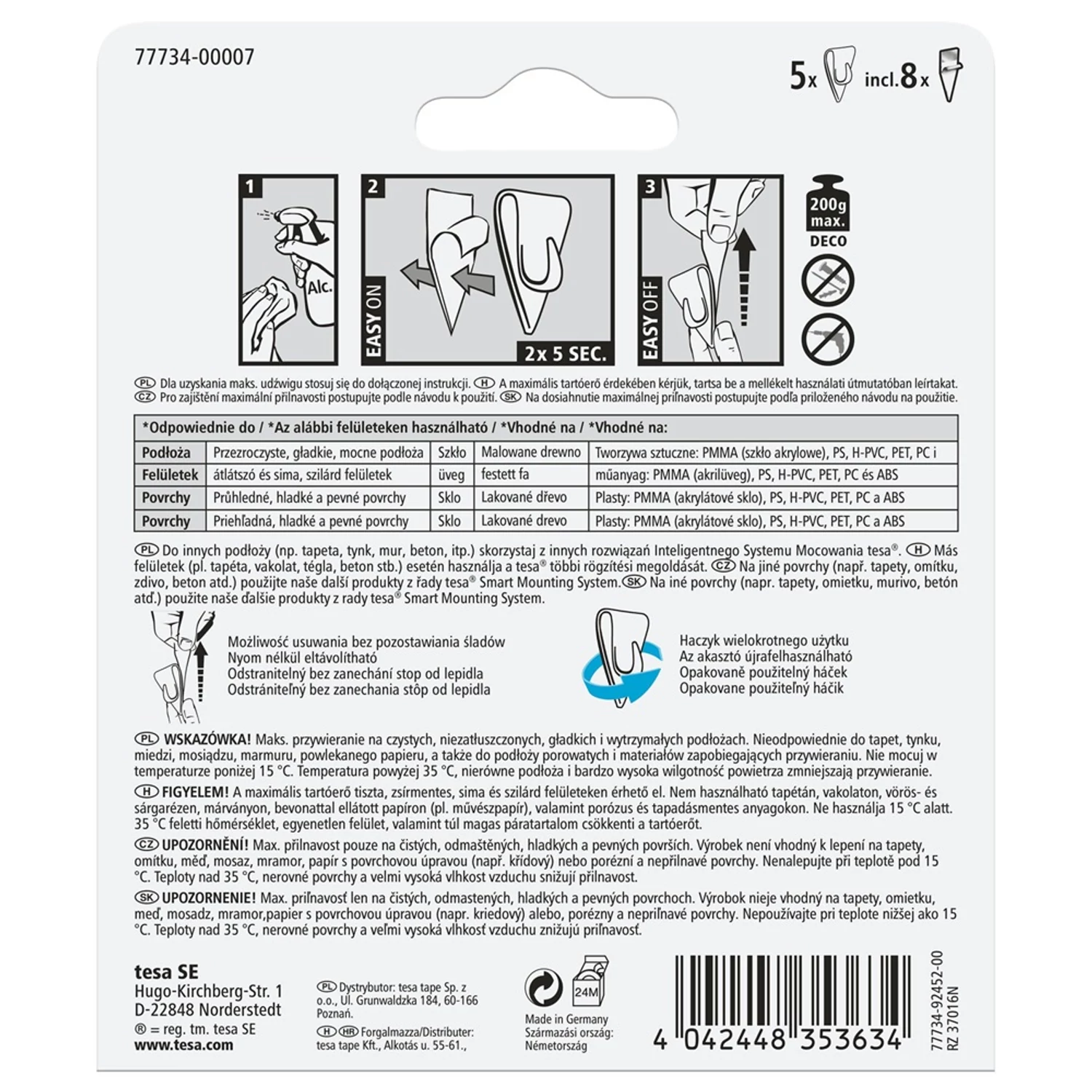 Egy-egy átlátszó öntapadós akasztó 0,2 kg súly megtartására képes, így remekül használhatók különböző dekorációs és használati tárgyak átlátszó, szilárd felületekre történő rögzítésére. Katalóguskód: 47025 Hiteles tájékoztatás: Elkötelezettek vagyunk termékeink biztonságának garantálásáért, nyomon követjük a termékbiztonsággal kapcsolatos valamennyi európai uniós és hazai szabályozást és biztosítjuk termékeink azoknak történő megfelelését. Az EU 2023/988-as számú Általános Termékbiztonsági Rendeletét (GPSR) is alkalmazzuk, így ha a termékeink biztonságát illetően fogyasztóként kérdése, észrevétele van, vagy esetleg balesetről van tudomása, kérjük, írja meg nekünk. GPSR: TESA SE Headquarter Europe Hugo-Kirchberg-Straße 1., 22848 Norderstedt, Germany tesa.Industrieinternetanfragen@tesa.com https://www.tesa.com/en