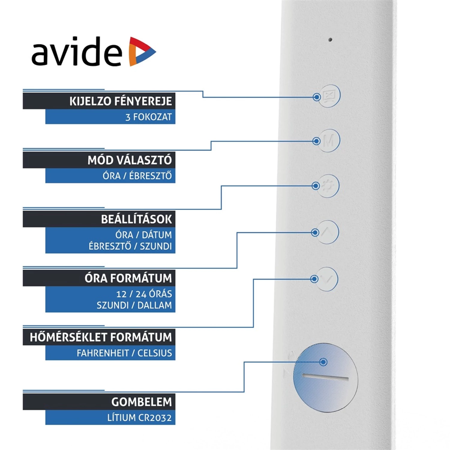 Avide LED Asztali Lámpa Irodai Bőrhatású Naptár Nathan Fehér 6W Bőrhatású, naptár funkcióval rendelkező, modern és praktikus világítási megoldás otthonra vagy irodába. A 6W teljesítményű, energiatakarékos LED fényforrás 360 lumen fényerőt biztosít. Naptárfunkció segít a hatékony időbeosztásban és a fontos dátumok emlékeztetésében. A lámpa könnyen állítható, irányítható a kívánt irányba. Fehér, bőrhatású felülettel rendelkezik, amely eleganciát és minőséget sugall. Ez a különleges részlet teszi a lámpát igazán egyedivé és vonzóvá. Modern LED asztali lámpa Érintésvezérlő panel az egyszerű kezeléshez Energiatakarékos LED technológia Világítástechnika Teljesítmény: 6W Fényáram:360 lm Színhőmérséklet: 5000K (semleges fehér) Világítási szög: 170° Színvisszaadási index: CRI >80 LED típus: SMD2835 LED-ek száma: 36 db Funkciók beépített LCD kijelző: Óra, Ébresztőóra, Naptár, Hőmérséklet funkcióval 3 lépéses fényerőszabályzás, érintésérzékelő gomb Műszaki adatok Feszültség: 220–240V Kimeneti feszültség: 5V Élettartam: 30 000 óra IP védelem: IP20 Anyag és kivitel Anyag: ABS Szín: Fehér Méretek Méret:183*140*590 mm Súly: 1069 g Garancia: 2 év Hiteles tájékoztatás: Elkötelezettek vagyunk termékeink biztonságának garantálásáért, nyomon követjük a termékbiztonsággal kapcsolatos valamennyi európai uniós és hazai szabályozást és biztosítjuk termékeink azoknak történő megfelelését. Az EU 2023/988-as számú Általános Termékbiztonsági Rendeletét (GPSR) is alkalmazzuk, így ha a termékeink biztonságát illetően fogyasztóként kérdése, észrevétele van, vagy esetleg balesetről van tudomása, kérjük, írja meg nekünk. GPSR: Bramcke Hungary Kft.,4031 Debrecen, Kishatár utca 17.https://bramcke.hu; info@bramcke.hu; +36 52 794 696