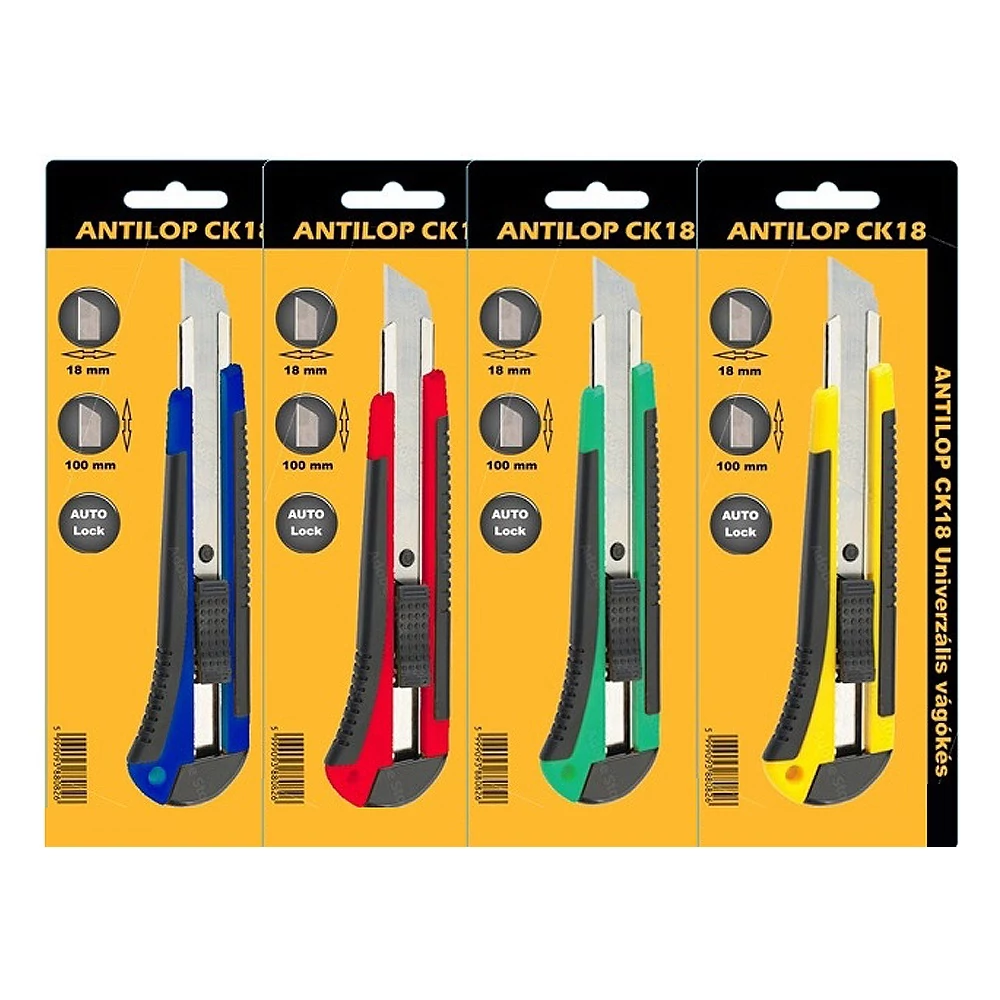 Barkácskés 18mm, gumírozott fogórész, fém vezetősínnel, Antilop vegyes színekben