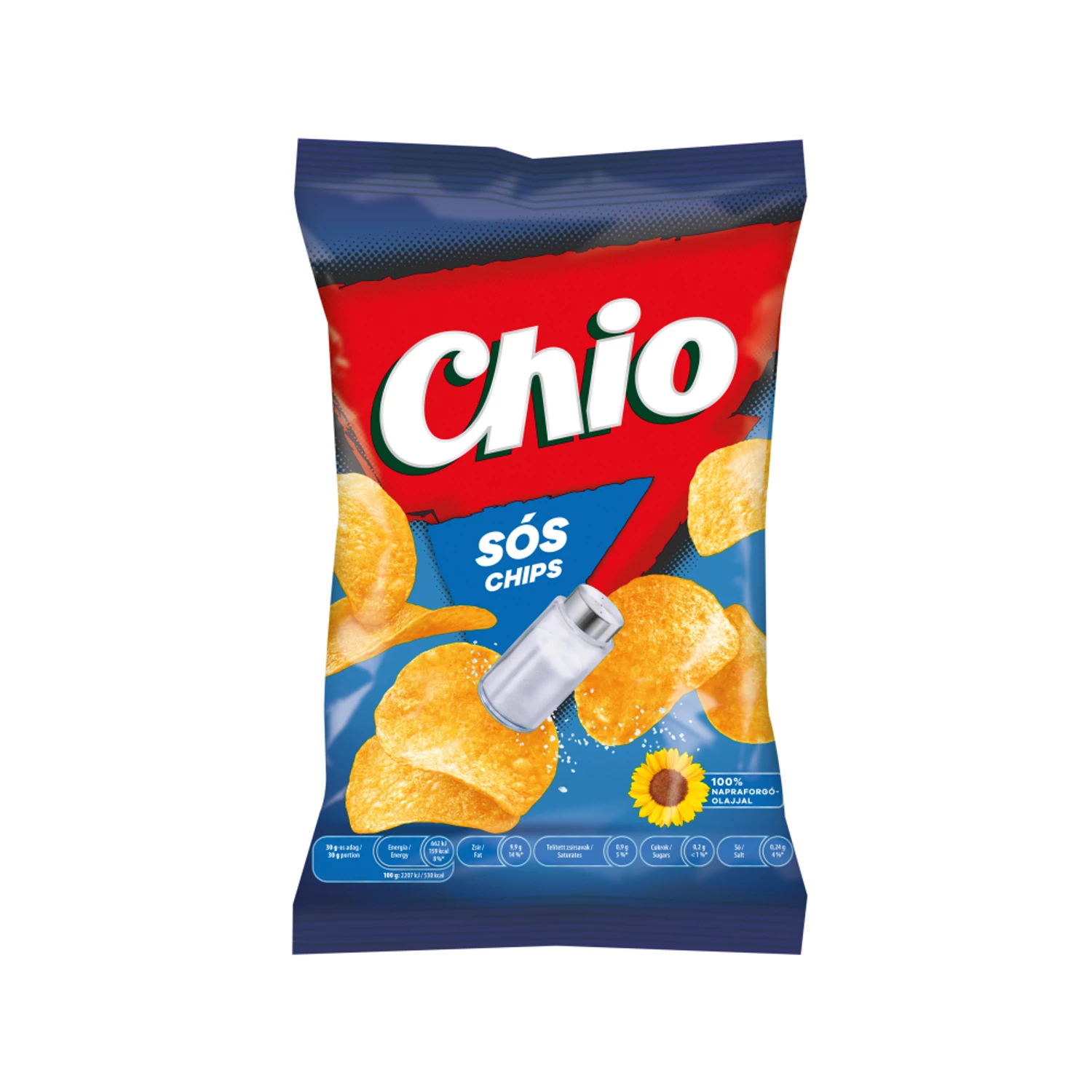 Sós burgonyachips, ÖSSZETEVŐK: burgonya (66 %), növényi olajok (napraforgó, repce változó arányban), étkezési só (1,3 %). Védőgázas csomagolásban. Nyomokban TEJET és GLUTÉNT tartalmazhat. Hiteles tájékoztatás: Elkötelezettek vagyunk termékeink biztonságának garantálásáért, nyomon követjük a termékbiztonsággal kapcsolatos valamennyi európai uniós és hazai szabályozást és biztosítjuk termékeink azoknak történő megfelelését. Az EU 2023/988-as számú Általános Termékbiztonsági Rendeletét (GPSR) is alkalmazzuk, így ha a termékeink biztonságát illetően fogyasztóként kérdése, észrevétele van, vagy esetleg balesetről van tudomása, kérjük, írja meg nekünk.
