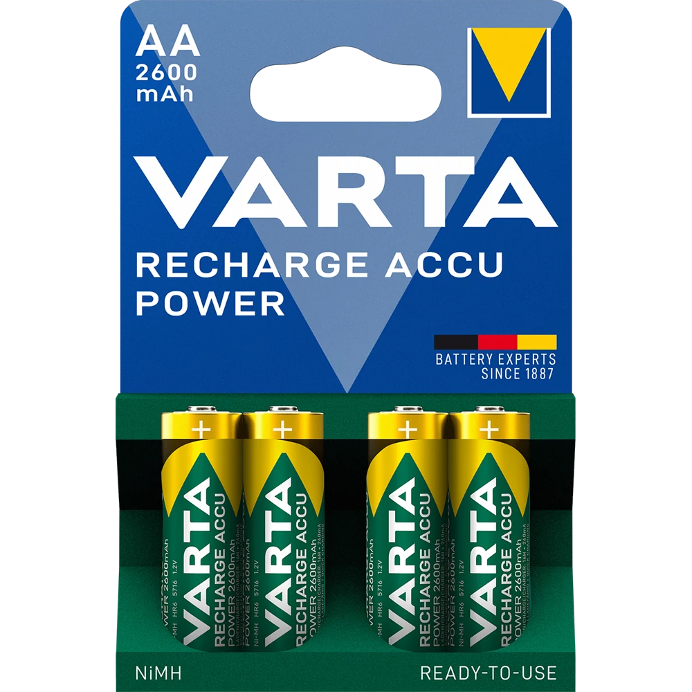 A VARTA Reacharge Accu Power akkumulátorai, a „Ready To Use” technológia révén azonnal használatra készek, nagyon alacsony önkisülési ráta mellett. Újratölthetőek a memóriaeffektus káros jelensége nélkül. Mindenféle töltőberendezésbe és szabványos készülékbe behelyezhetőek. Alacsony, valamint magas energiaigényű készülékekhez is egyaránt használhatóak. Előre töltött, közvetlenül a csomagolásból kivéve használatra kész. Tárolás során kapacitásának 75%-át képes megőrizni akár 12 hónap után is. Kompatibilis bármely töltővel és használható bármely eszközhöz. Válassza a Varta akkumulátorait, melyekkel számos elemet tud helyettesíteni, pénzt spórolhat, valamint a környezetet is védi! Igazán gazdaságos megoldás minden helyzetben! Termék tulajdonságok: Hiteles tájékoztatás: Elkötelezettek vagyunk termékeink biztonságának garantálásáért, nyomon követjük a termékbiztonsággal kapcsolatos valamennyi európai uniós és hazai szabályozást és biztosítjuk termékeink azoknak történő megfelelését. Az EU 2023/988-as számú Általános Termékbiztonsági Rendeletét (GPSR) is alkalmazzuk, így ha a termékeink biztonságát illetően fogyasztóként kérdése, észrevétele van, vagy esetleg balesetről van tudomása, kérjük, írja meg nekünk. GPSR: VARTA AG, VARTA-Platz 1 73479 Ellwangen/Germany, info@varta-ag.com , www.varta-ag.com