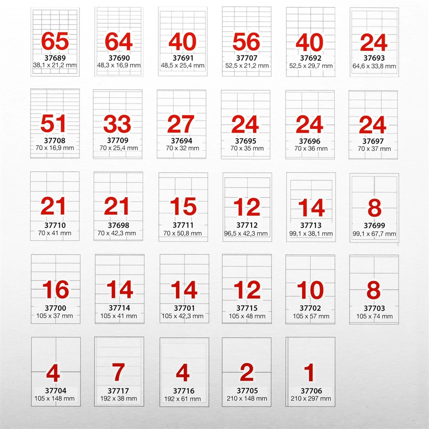 a-series etikett címkék A4-es lapokon. Méretek: 48,5x25,4 mm, szín: fehér, anyaga: címkepapír (60 g / m2), ragasztó: öntapadó (tartós ragasztó), címkék csomagonként: 4000 darab, lapok csomagonként: 100 lap. Nyomtatható: minden lézer- és tintasugaras nyomtatóval, fénymásolóval, színes lézernyomtatókkal és színes fénymásolókkal. Kivitel: préselt, körbefutó biztonsági él, fehér klímavédő csomagolás. Katalóguskód: 37691 Hiteles tájékoztatás: Elkötelezettek vagyunk termékeink biztonságának garantálásáért, nyomon követjük a termékbiztonsággal kapcsolatos valamennyi európai uniós és hazai szabályozást és biztosítjuk termékeink azoknak történő megfelelését. Az EU 2023/988-as számú Általános Termékbiztonsági Rendeletét (GPSR) is alkalmazzuk, így ha a termékeink biztonságát illetően fogyasztóként kérdése, észrevétele van, vagy esetleg balesetről van tudomása, kérjük, írja meg nekünk. GPSR: Orink Hungary Kft.; H-1151 Budapest, Károlyi Sándor út 160.; info@orinkhungary.hu; https://orink.hu/