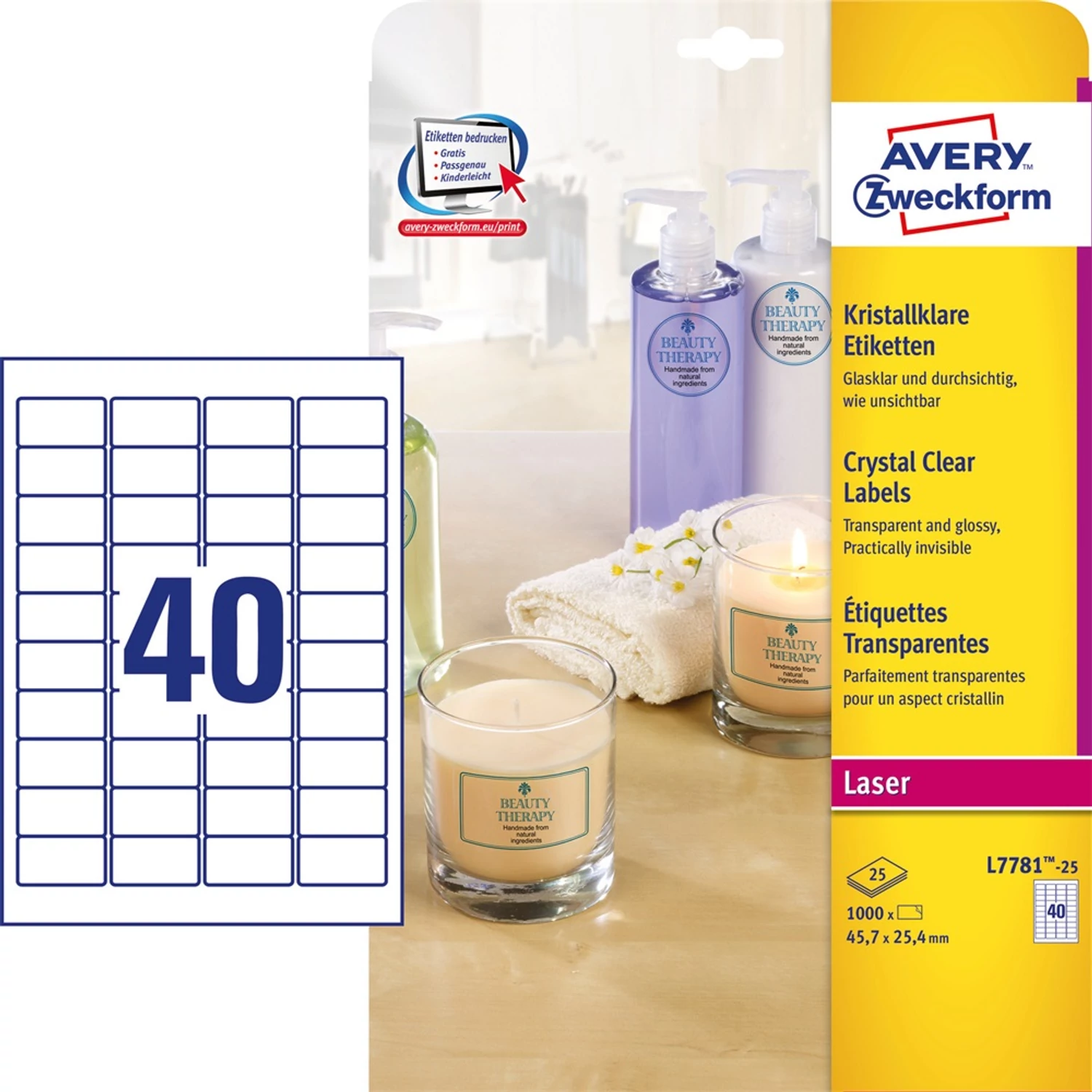 Etikett címke, 45,7 x25,4mm,víztiszta, 40 címke/ív, 25 ív/doboz, Avery átlátszó
