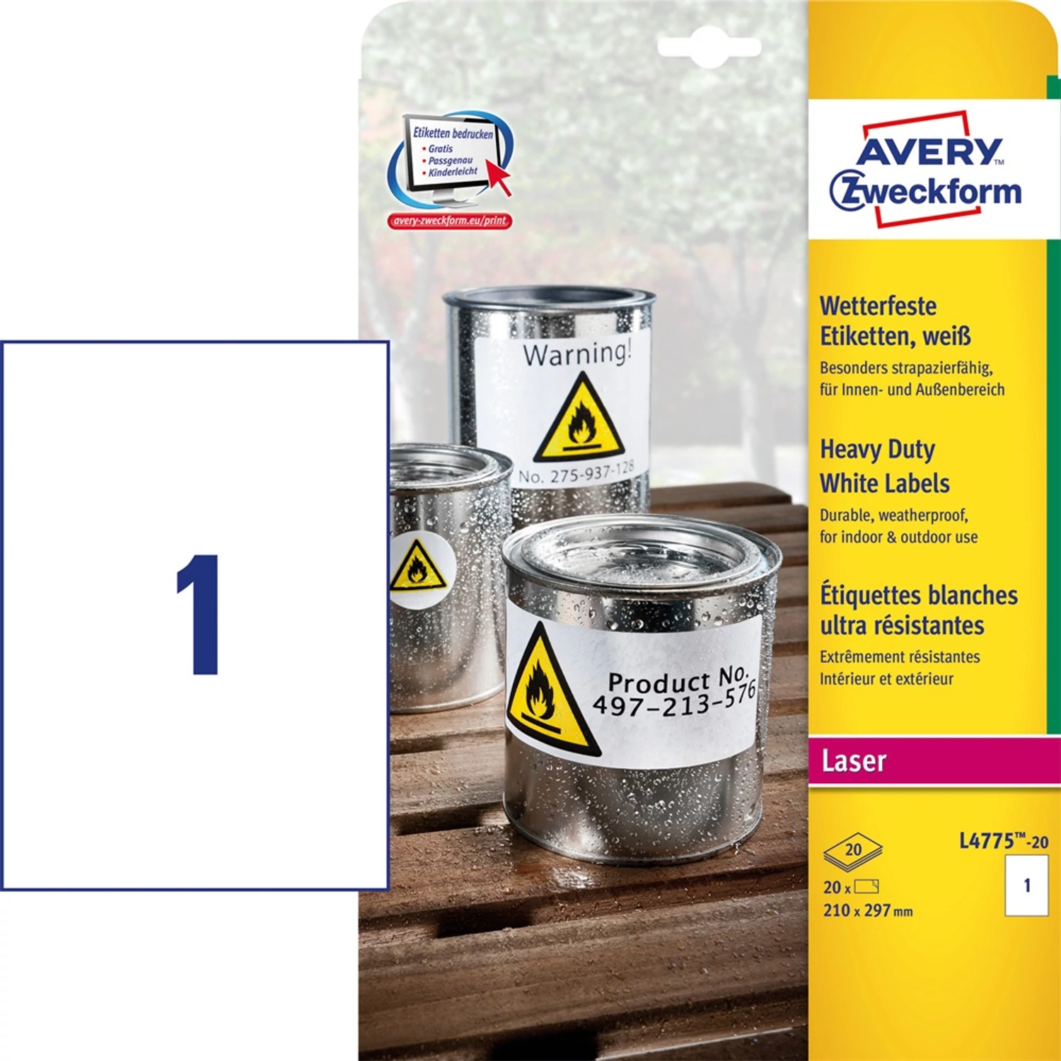 Etikett címke, 210 x297mm, időjárásálló poliészter, 1 címke/ív, 20 ív/doboz, Avery fehér