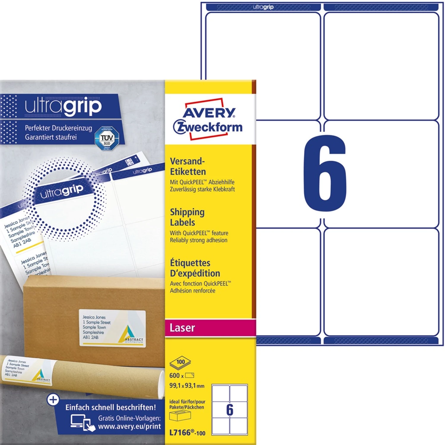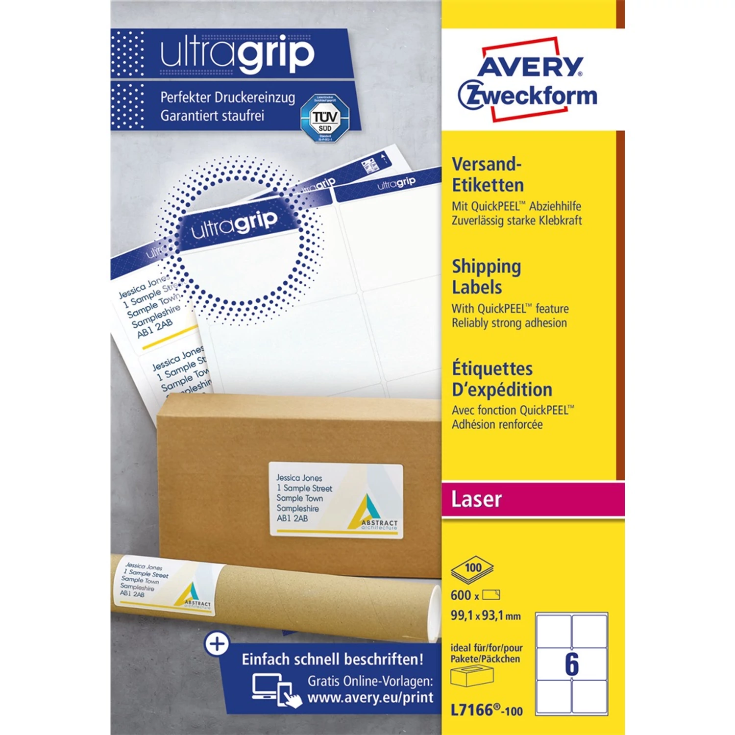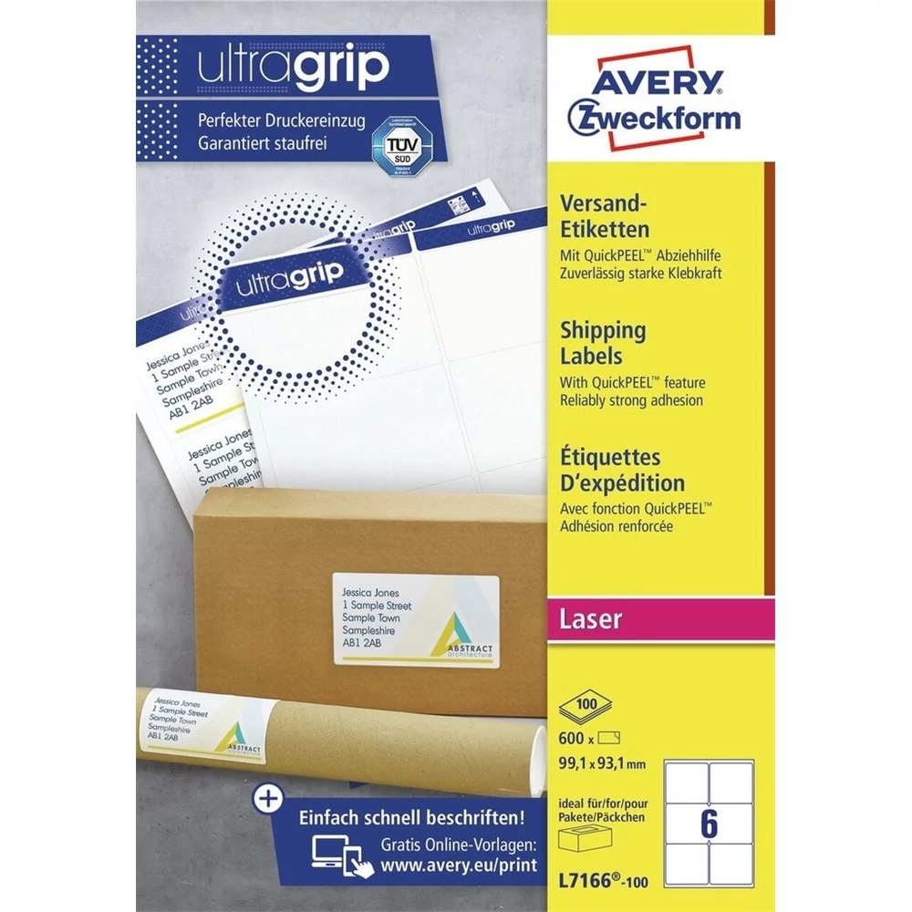 Címke mérete: 99,1 x 93,1 mm Doboz tartalma: 600 címke címke - 100 ív/doboz (6 címke/ lap)Tökéletesen alkalmas csomagok és küldemények felcímzéséhez. Az átlátszatlan csomagcímke megbízhatóan fedi el a korábbi címkéket vagy feliratokat - ezért ideális használt csomagolóanyagok, dobozok újra felhasználására. Biztos lehet az elakadásmentes nyomtatásban, hiszen ragasztómaradvány nem kerül a nyomtatóba. A problémamentes nyomtatás a lézernyomtatók esetén a TÜV SÜD által bevizsgált és tanúsított. Tökéletes címkézést, tűéles képeket, tökéletes toner tapadást és elkenődésmentes felületet garantálnak. Környezetbarát, FSC® minősített és klórmentes eljárással fehérített. Tervezze meg és nyomtassa ki címkéit gyorsan és egyszerűen - ingyenes szoftverünkért és sablonjainkért látogasson el a http://www.avery.hu/templates-software/ weboldalra vagy használja a Microsoft® Office csomagokba beépített sablonjainkat! Extra gyors kezelés, köszönhetően az innovatív QuickPEEL™ tulajdonságnak. Kifejezetten lézernyomtatókhoz fejlesztve.Katalóguskód: 25301 Hiteles tájékoztatás: Elkötelezettek vagyunk termékeink biztonságának garantálásáért, nyomon követjük a termékbiztonsággal kapcsolatos valamennyi európai uniós és hazai szabályozást és biztosítjuk termékeink azoknak történő megfelelését. Az EU 2023/988-as számú Általános Termékbiztonsági Rendeletét (GPSR) is alkalmazzuk, így ha a termékeink biztonságát illetően fogyasztóként kérdése, észrevétele van, vagy esetleg balesetről van tudomása, kérjük, írja meg nekünk. GPSR: AVERY ZWECKFORM GmbH Miesbacher Str. 5 D-83626 Oberlaindern/Valley, kundenservice@avery.com, www.avery.eu