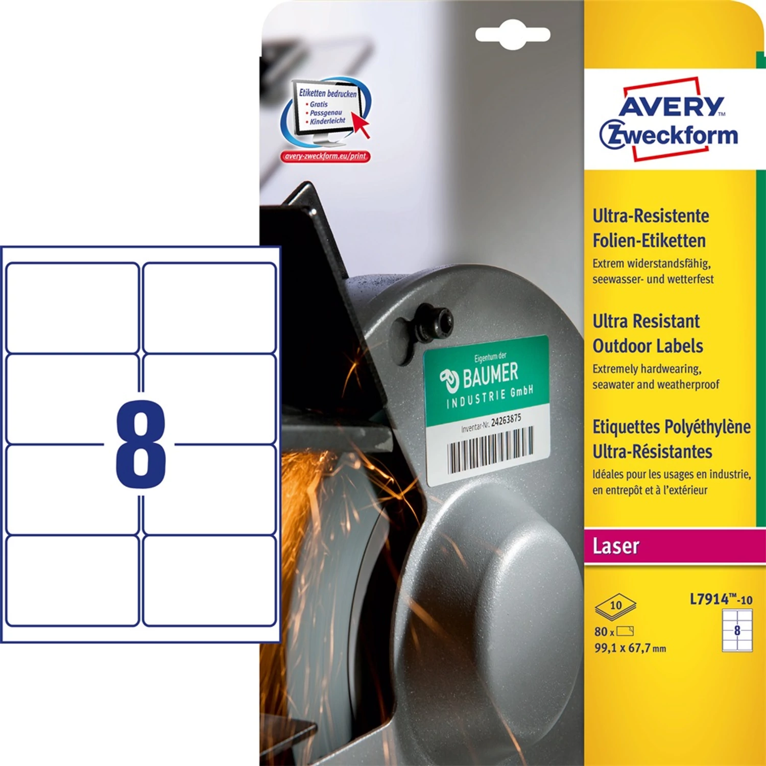 Címke mérete: 99,1 x 67,7 mmDoboz tartalma: 80 címke címke - 10ív/doboz (8 címke/ lap) Ultra ellenálló film címkéit, kiemelkedően nagy strapabíróság jellemzi, hogy megfeleljen a legmagasabb követelményeknek bel- és kültéren egyaránt. Felületkezelt, matt, rugalmas polietilén címke. Az erős, tartós tapadású ragasztónak köszönhetően, akár durvább felületeken tökéletesen tapad, különösen jól használható a termelésben, raktározásban, tárolóedények, szerszámok, gépek felcímkézésére vagy megjelölésére. A sós tengervíznek is ellenálló film etikett rendkívül strapabíró, időjárásálló, olaj-, szennyeződés-, UV- és hőálló (-40°C és +150°C között). Mindemellett az etikettek lemoshatóak, ellenállnak a legtöbb oldó- és tisztítószernek. Tervezze meg és nyomtassa ki címkéit gyorsan és egyszerűen - ingyenes szoftverünkért és sablonjainkért látogasson el a http://www.avery.hu/templates-software/ weboldalra vagy használja a Microsoft® Office csomagokba beépített sablonjainkat! Kifejezetten lézernyomtatókhoz fejlesztve.Katalóguskód: 25348 Hiteles tájékoztatás: Elkötelezettek vagyunk termékeink biztonságának garantálásáért, nyomon követjük a termékbiztonsággal kapcsolatos valamennyi európai uniós és hazai szabályozást és biztosítjuk termékeink azoknak történő megfelelését. Az EU 2023/988-as számú Általános Termékbiztonsági Rendeletét (GPSR) is alkalmazzuk, így ha a termékeink biztonságát illetően fogyasztóként kérdése, észrevétele van, vagy esetleg balesetről van tudomása, kérjük, írja meg nekünk. GPSR: AVERY ZWECKFORM GmbH Miesbacher Str. 5 D-83626 Oberlaindern/Valley, kundenservice@avery.com, www.avery.eu