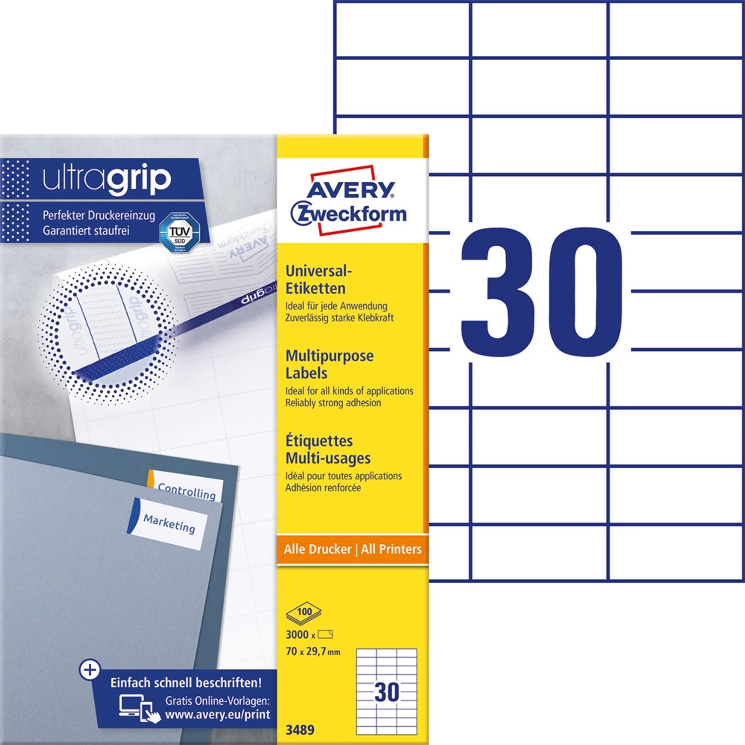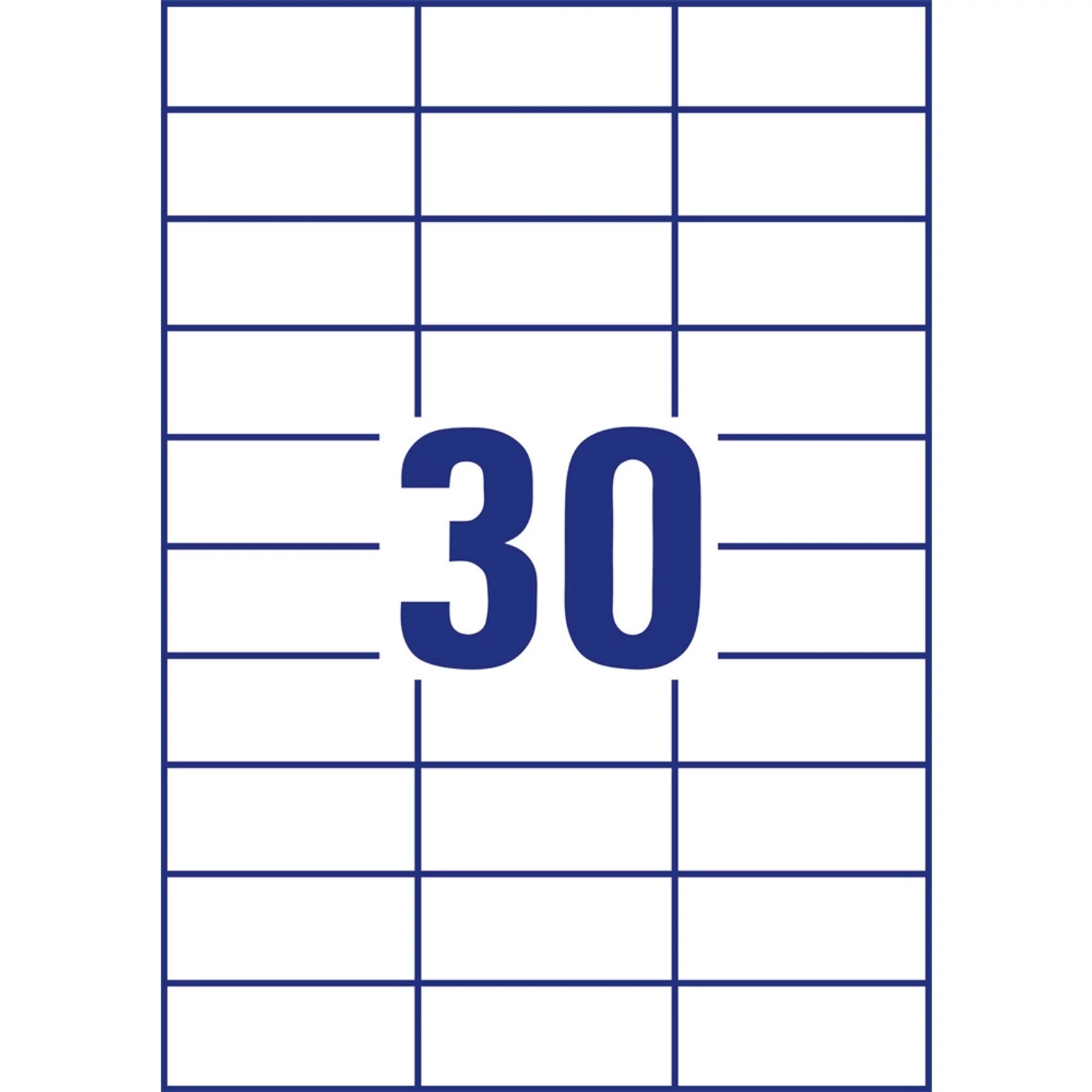 Etikett címke, 70 x29,7mm, univerzális, 30 címke/ív, 100 ív/doboz, Avery fehér