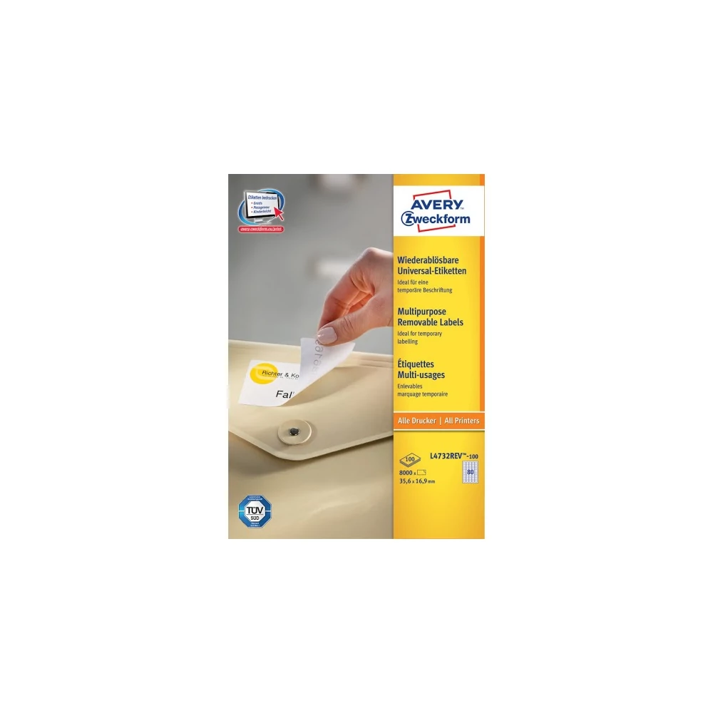Etikett címke, 35,6 x16,9mm, univerzális visszaszedhető, 80 címke/ív, 100 ív/doboz, Avery fehér
