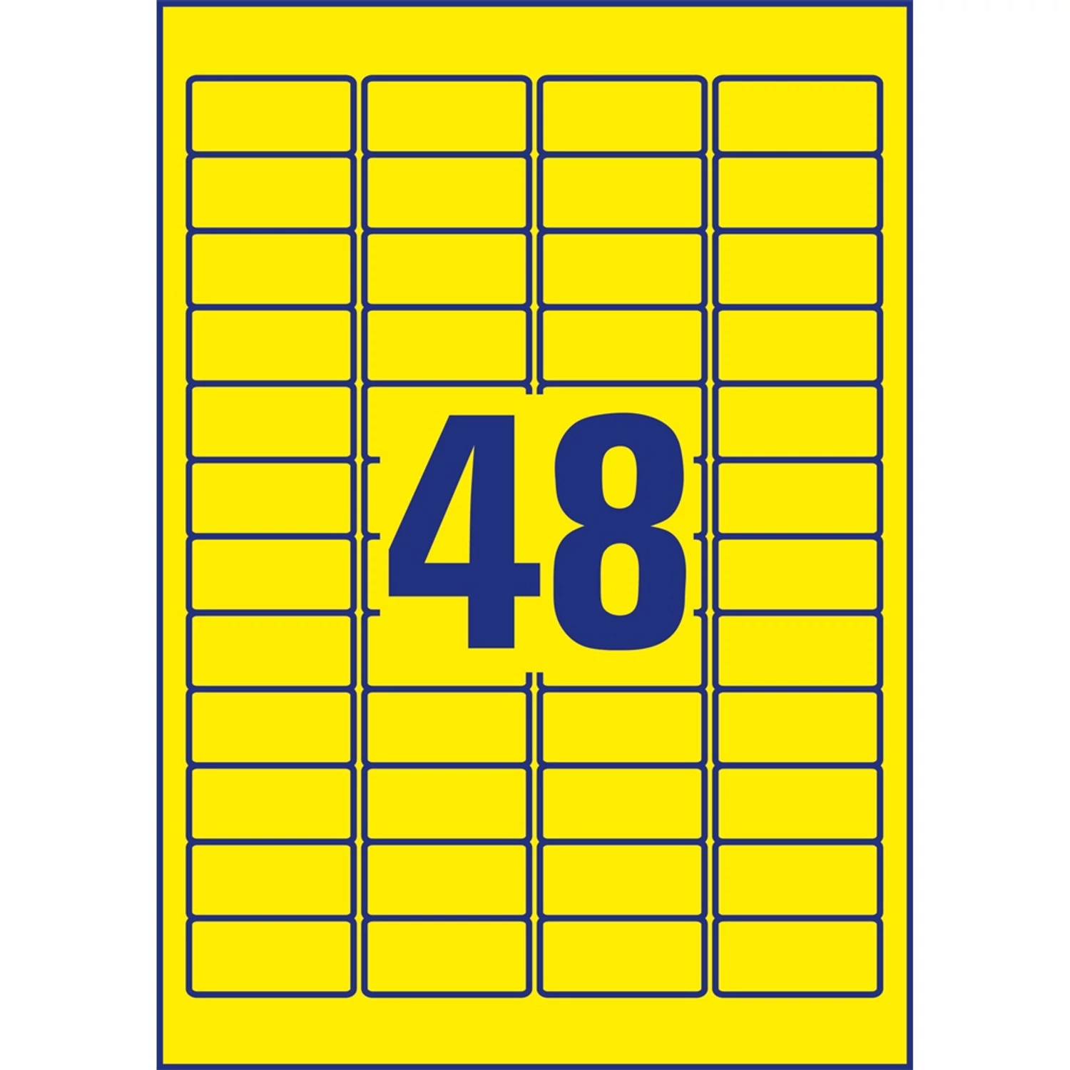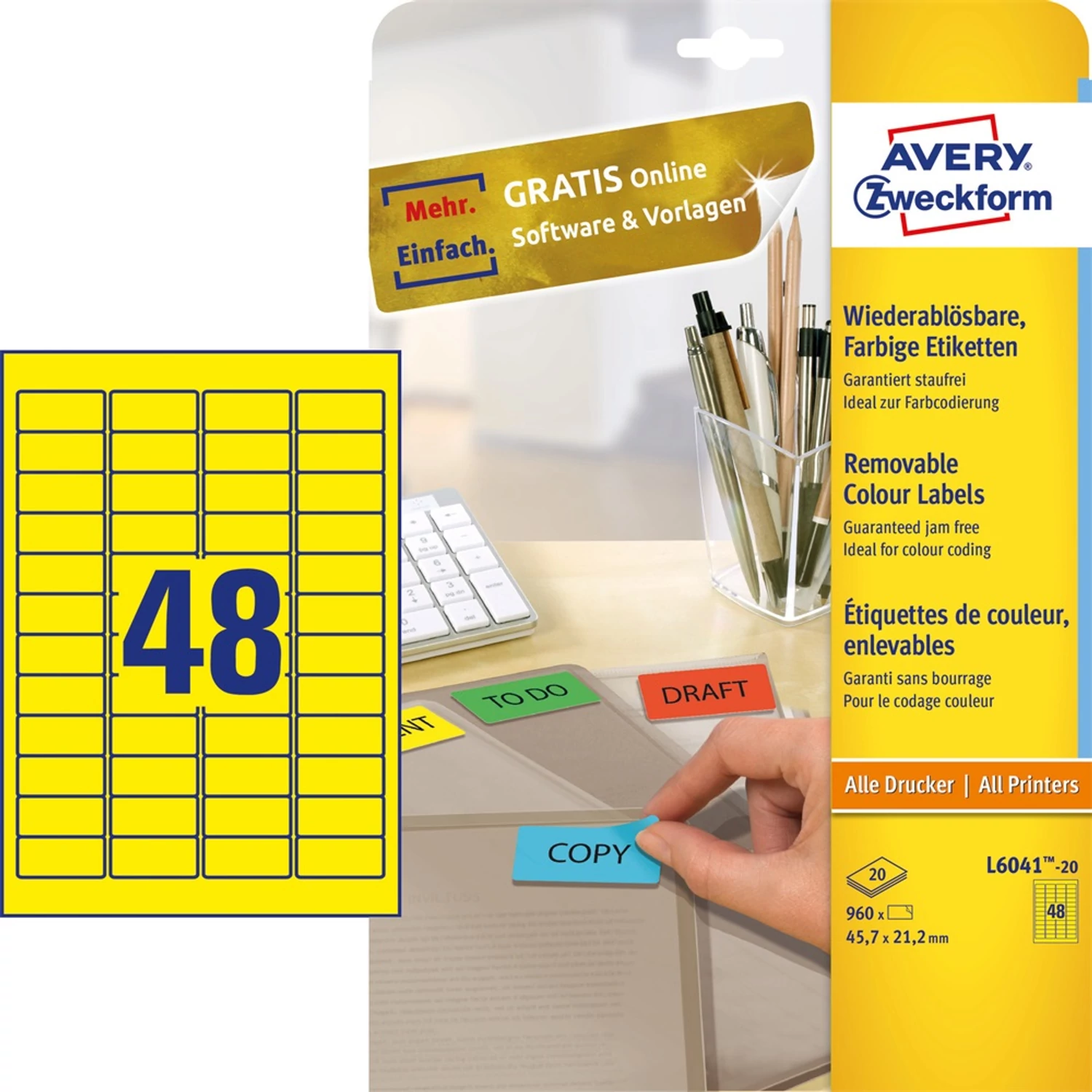 Etikett címke, 45,7 x21,2mm, univerzális visszaszedhető, 48 címke/ív, 20 ív/doboz, Avery sárga