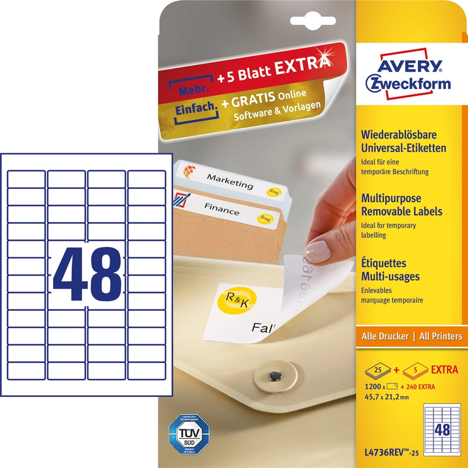 Címke mérete: 45,7 x 21,2 mm Doboz tartalma: 1200 + 240 extra darab címke - 25 + extra ív/ doboz (48 címke/lap) Tökéletesen alkalmas pl. fűszercímkéknek, stb. (1200 címke/csomag). A címkék megbízhatóan tapadnak, ugyanakkor ragasztómaradvány nélkül eltávolíthatóak a legtöbb felületről. Biztos lehet abban, hogy az ívek nem akadnak el nyomtatás közben és nem kerül ragasztómaradvány a nyomtatójába. A problémamentes nyomtatás a lézernyomtatók esetén a TÜV SÜD által bevizsgált és tanúsított. Az univerzális etikettek tökéletes címkézést, tűéles képeket, tökéletes toner tapadást és elkenődésmentes felületet garantálnak. Környezetbarát, FSC® minősített és klórmentes eljárással fehérített. Tervezze meg és nyomtassa ki címkéit gyorsan és egyszerűen - ingyenes szoftverünkért és sablonjainkért látogasson el a http://www.avery.hu/templates-software/ weboldalra vagy használja a Microsoft® Office csomagokba beépített sablonjainkat! Optimalizált minőség tintasugaras, lézer és színes lézer nyomtatókhoz, fénymásolókhoz. Katalóguskód: 25281 Hiteles tájékoztatás: Elkötelezettek vagyunk termékeink biztonságának garantálásáért, nyomon követjük a termékbiztonsággal kapcsolatos valamennyi európai uniós és hazai szabályozást és biztosítjuk termékeink azoknak történő megfelelését. Az EU 2023/988-as számú Általános Termékbiztonsági Rendeletét (GPSR) is alkalmazzuk, így ha a termékeink biztonságát illetően fogyasztóként kérdése, észrevétele van, vagy esetleg balesetről van tudomása, kérjük, írja meg nekünk. GPSR: AVERY ZWECKFORM GmbH Miesbacher Str. 5 D-83626 Oberlaindern/Valley, kundenservice@avery.com, www.avery.eu