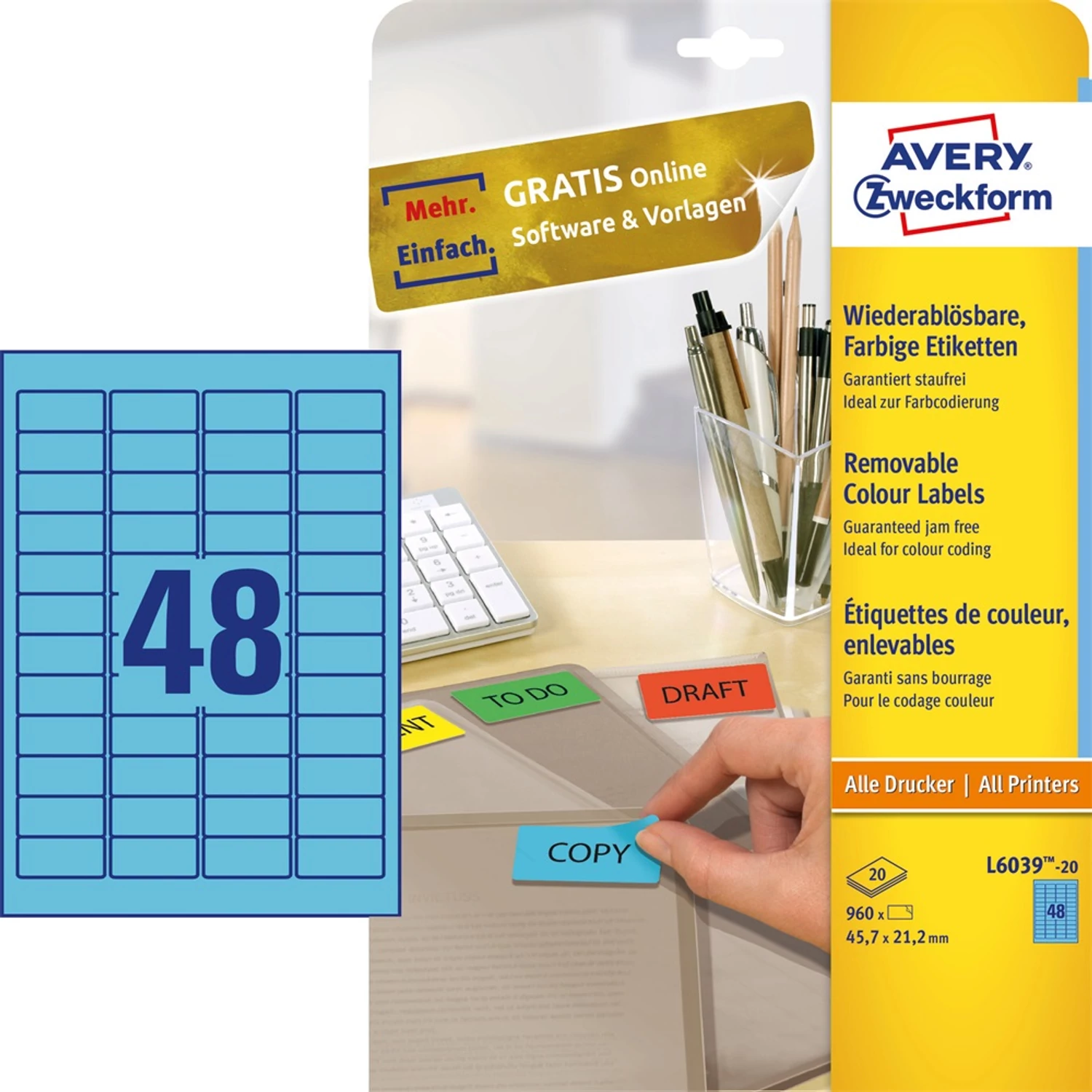 Címke mérete: 45,7 x 21,2 mm Doboz tartalma: 960 darab címke - 20 ív/doboz (48 címke/ lap) Tökéletesen alkalmas például arra, hogy színkódok segítségével rendszerezzünk dokumentumokat, termékeket. Biztos lehet az elakadásmentes nyomtatásban, hiszen ragasztómaradvány nem kerül a nyomtatóba. Tervezze meg és nyomtassa ki címkéit gyorsan és egyszerűen - ingyenes szoftverünkért és sablonjainkért látogasson el a http://www.avery.hu/templates-software/ weboldalra vagy használja a Microsoft® Office csomagokba beépített sablonjainkat! Optimalizált minőség tintasugaras, lézer és színes lézer nyomtatókhoz, fénymásolókhoz. Katalóguskód: 25288 Hiteles tájékoztatás: Elkötelezettek vagyunk termékeink biztonságának garantálásáért, nyomon követjük a termékbiztonsággal kapcsolatos valamennyi európai uniós és hazai szabályozást és biztosítjuk termékeink azoknak történő megfelelését. Az EU 2023/988-as számú Általános Termékbiztonsági Rendeletét (GPSR) is alkalmazzuk, így ha a termékeink biztonságát illetően fogyasztóként kérdése, észrevétele van, vagy esetleg balesetről van tudomása, kérjük, írja meg nekünk. GPSR: AVERY ZWECKFORM GmbH Miesbacher Str. 5 D-83626 Oberlaindern/Valley, kundenservice@avery.com, www.avery.eu