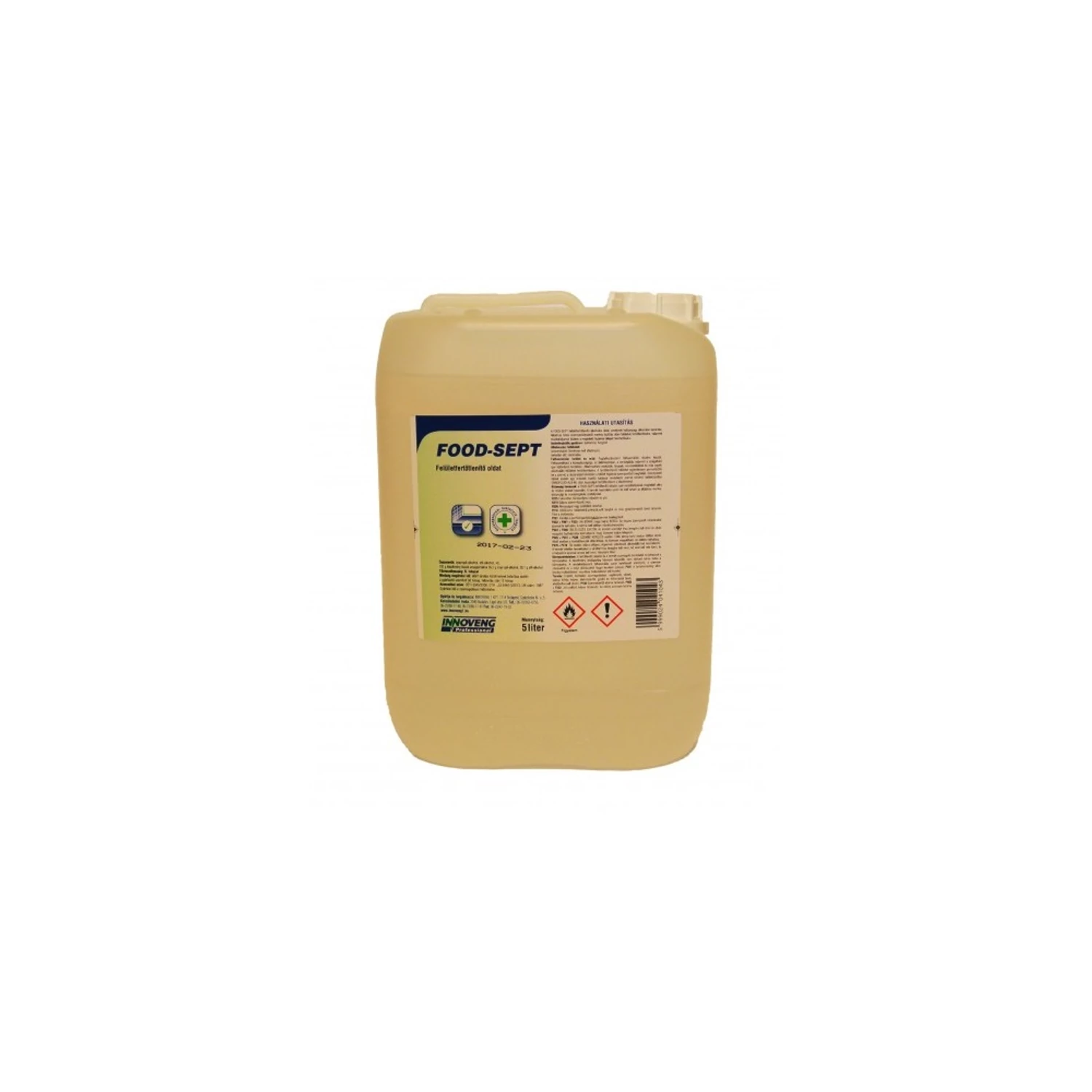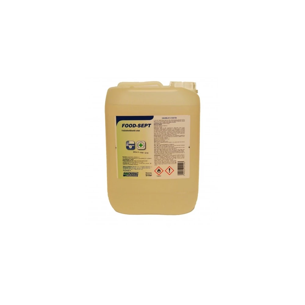 Foglalkozásszerű felhasználók részére készült, felhasználásra kész folyadék (terméktípus PT2, PT4). Felhasználható a közegészségügy, az élelmiszeripar, a vendéglátás valamint a szolgáltató ipar különböző területein. Alkalmazható munkaeszközök, tárgyak, munkafelületek és más egyéb alkoholálló felületek A fertőtlenítendő felületet egyenletesen permetezzük be a szerrel, kezeletlen részek ne maradjanak, majd hagyjuk a felületre rászáradni. GHS piktogram: Figyelmeztetés: Veszély Figyelmeztető mondatok:H225 Fokozottan tűzveszélyes folyadék és gőz, H319 Súlyos szemirritációt okoz, H336 Álmosságot vagy szédülést okozhat Koncentráció: töményen kell alkalmazni Kiszerelés: 5 literes kanna Szavatossági idő: 36 hónap A Fertőtlenítő hatású tisztítószer 5 liter Food-Sept termék alkalmazásakor ügyeljen a biztonságra! Használat előtt mindig olvassa el a címkét és a használati útmutatót! Katalóguskód: 42346