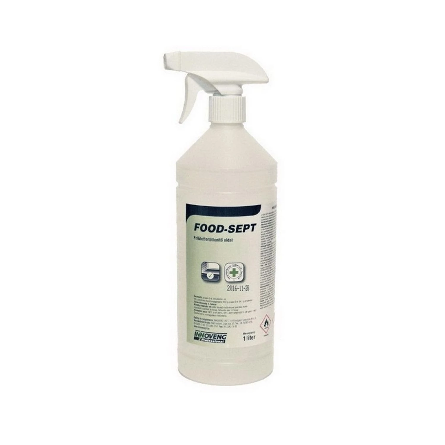 Foglalkozásszerű felhasználók részére készült, felhasználásra kész folyadék (terméktípus PT2, PT4). Felhasználható a közegészségügy, az élelmiszeripar, a vendéglátás valamint a szolgáltató ipar különböző területein. Alkalmazható munkaeszközök, tárgyak, munkafelületek és más egyéb alkoholálló felületek A fertőtlenítendő felületet egyenletesen permetezzük be a szerrel, kezeletlen részek ne maradjanak, majd hagyjuk a felületre rászáradni. GHS piktogram: Figyelmeztetés: Veszély Figyelmeztető mondatok: H225 Fokozottan tűzveszélyes folyadék és gőz, H319 Súlyos szemirritációt okoz, H336 Álmosságot vagy szédülést okozhat Koncentráció: töményen kell alkalmazni Szavatossági idő: 36 hónap Kiszerelés: 1 literes flakon A Fertőtlenítő hatású tisztítószer szórófejes 1 liter Food-Sept termék alkalmazásakor ügyeljen a biztonságra! Használat előtt mindig olvassa el a címkét és a használati útmutatót! Katalóguskód: 42347