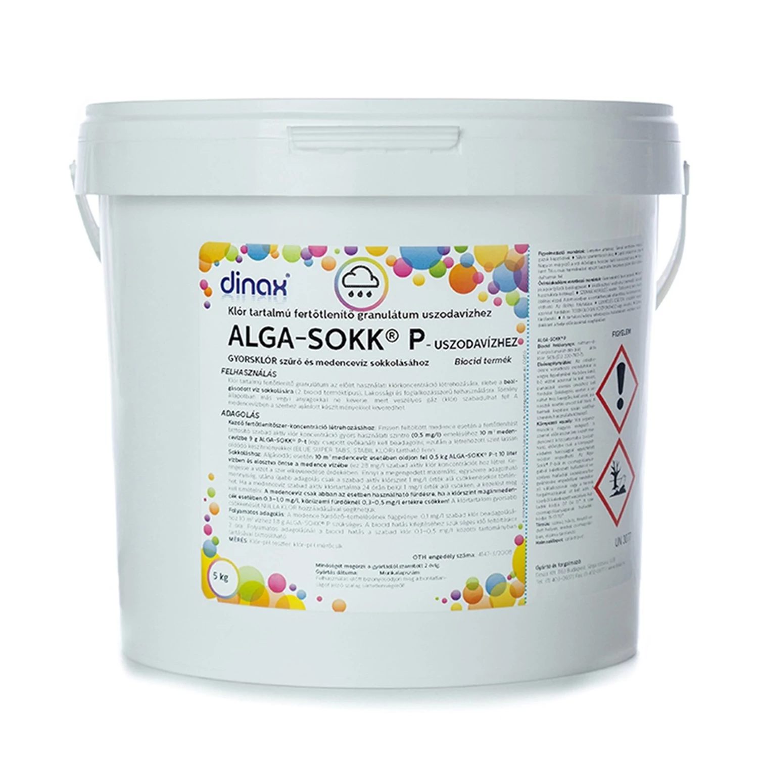 Klóros fertőtlenítőszer az előírt vegyszerkoncentráció létrehozására, illetve a bealgásodott víz sokkolására A szert egy vödörben oldja fel, és úgy öntse a medencevízhez (minden esetben a vízbe töltse a granulátumot, és ne fordítva!) Foltos algásodás esetén is használható. GHS piktogram: Figyelmeztetés: Figyelem Figyelmeztető mondatok: H302 Lenyelve ártalmas, H319 Súlyos szemirritációt okoz, H335 Légúti irritációt okozhat, H410 Nagyon mérgező a vízi élővilágra, hosszan tartó károsodást okoz ADR kód: UN3077 Kiszerelés: 5 kg / kanna Fertőtlenítőszer 5 kg Alka-Sokk P Dinax termék alkalmazásakor ügyeljen a biztonságra! Használat előtt mindig olvassa el a címkét és a használati útmutatót! Katalóguskód: 42852