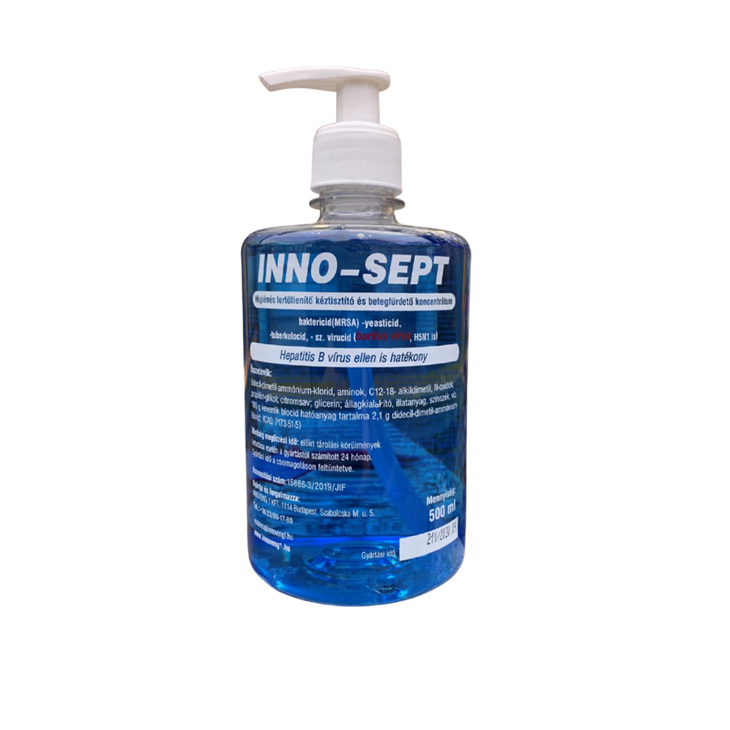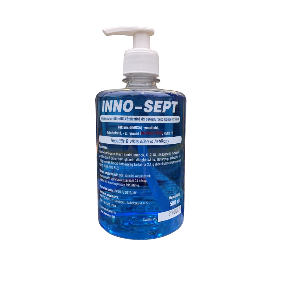 Felhasználásra kész folyadék lakossági és foglalkozásszerű felhasználók részére, amely alkalmas minden olyan területen ahol a kéz tisztítása mellett annak fertőtlenítésére is szükség van. Betegfürdetésnél a nedves bőrfelületet INNO-SEPT oldattal átitatott szivacs segítségével habosítva töröljük át, majd a behatási idő letelte után meleg vízzel, alaposan öblítsük le és a bőrfelületet törüljük szárazra. GHS piktogram: Figyelmeztetés: Veszély Figyelmeztető mondatok: H315 - Bőrirritáló hatású, H318 - Súlyos szemkárosodást okoz. Kiszerelés: 500 ml / flakon Szavatossági idő: 24 hónap A Folyékony szappan fertőtlenítő hatással 500 ml pumpás Inno-Sept termék alkalmazásakor ügyeljen a biztonságra! Használat előtt mindig olvassa el a címkét és a használati útmutatót! Katalóguskód: 41014