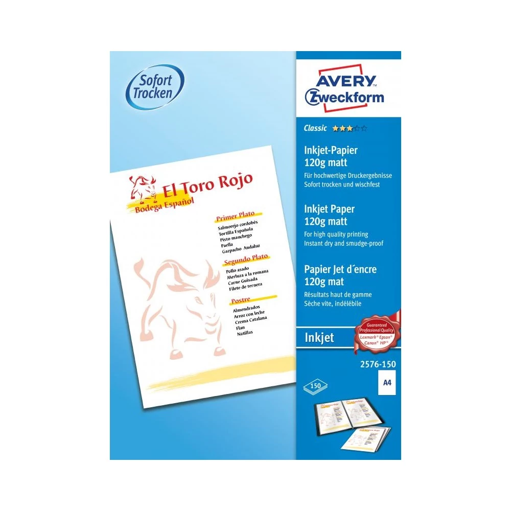 2576-150 kódszámú, A4 méretű AVERY ZWECKFORM szuperior tintasugaras matt fotópapírral a legjobb minőségű nyomtatási eredményt érheti el. 150 ív egy csomagban. A speciális matt bevonat kiváló színmeghatározást és színekben gazdag nyomtatot biztosít. Az extra erős 120g-os tintasugaras fotópapír nyomtatás után azonnal szárad és elkenődésmentes a hatékony száradási tulajdonságnak köszönhetően. Az Avery Zweckform tintasugaras nyomtatópapír tökéletes professzionális prezentációk és menülapok nyomtatására. FSC® minősített papír, mely felelősen kezelt erdőből származik.Katalóguskód: 47577 Hiteles tájékoztatás: Elkötelezettek vagyunk termékeink biztonságának garantálásáért, nyomon követjük a termékbiztonsággal kapcsolatos valamennyi európai uniós és hazai szabályozást és biztosítjuk termékeink azoknak történő megfelelését. Az EU 2023/988-as számú Általános Termékbiztonsági Rendeletét (GPSR) is alkalmazzuk, így ha a termékeink biztonságát illetően fogyasztóként kérdése, észrevétele van, vagy esetleg balesetről van tudomása, kérjük, írja meg nekünk. GPSR: AVERY ZWECKFORM GmbH Miesbacher Str. 5 D-83626 Oberlaindern/Valley, kundenservice@avery.com, www.avery.eu
