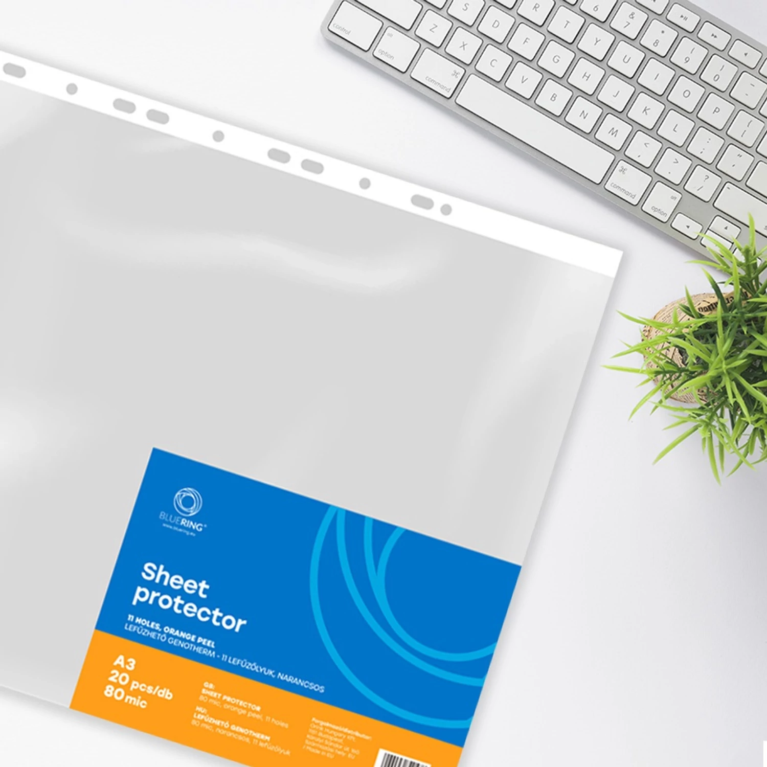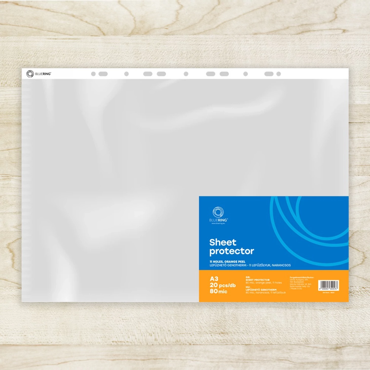 A3-as méretben gondolkodsz, posztereket, rajzokat, vizuális terveket vagy menütáblákat szeretnél átláthatóan, mégis védetten tárolni? A Bluering® 80 mikronos, narancsos (orange-peel) felületű genothermje pont erre készült. Az álló (portrait) kialakítás felül nyitott, így a nagy lapokat könnyen csúsztatod be–ki, a lefűző perforáció pedig kompatibilis a többgyűrűs A3-as mappákkal. A narancsos textúra nem színre utal, hanem enyhén matt, tükröződéscsökkentő felületre, ami csökkenti a csillogást – prezentációknál és erősebb világításban ez aranyat ér.