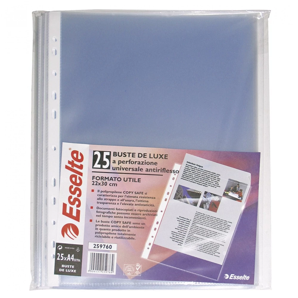 Minőségi tasak mindennapos használatra. Az univerzális lyukasztású lefűzőcsíknak köszönhetően kényelmes tárolási megoldást biztosít dokumentumok számára bármilyen iratrendezőben, gyűrűskönyvben. Víztiszta, 55 mikron vastag, újrahasznosított PP alapanyag. Felül nyitott, melynek köszönhetően a dokumentumok könnyen kiemelhetők a tasakból akár magában az iratrendezőben is. A 11 lefűzőlyuknak köszönhetően bármilyen iratrendezőben, gyűrűskönyvben használható. A4 mérethez. Katalóguskód: 523 Hiteles tájékoztatás: Elkötelezettek vagyunk termékeink biztonságának garantálásáért, nyomon követjük a termékbiztonsággal kapcsolatos valamennyi európai uniós és hazai szabályozást és biztosítjuk termékeink azoknak történő megfelelését. Az EU 2023/988-as számú Általános Termékbiztonsági Rendeletét (GPSR) is alkalmazzuk, így ha a termékeink biztonságát illetően fogyasztóként kérdése, észrevétele van, vagy esetleg balesetről van tudomása, kérjük, írja meg nekünk. GPSR: LEITZ ACCO Brands GmbH & Co KG