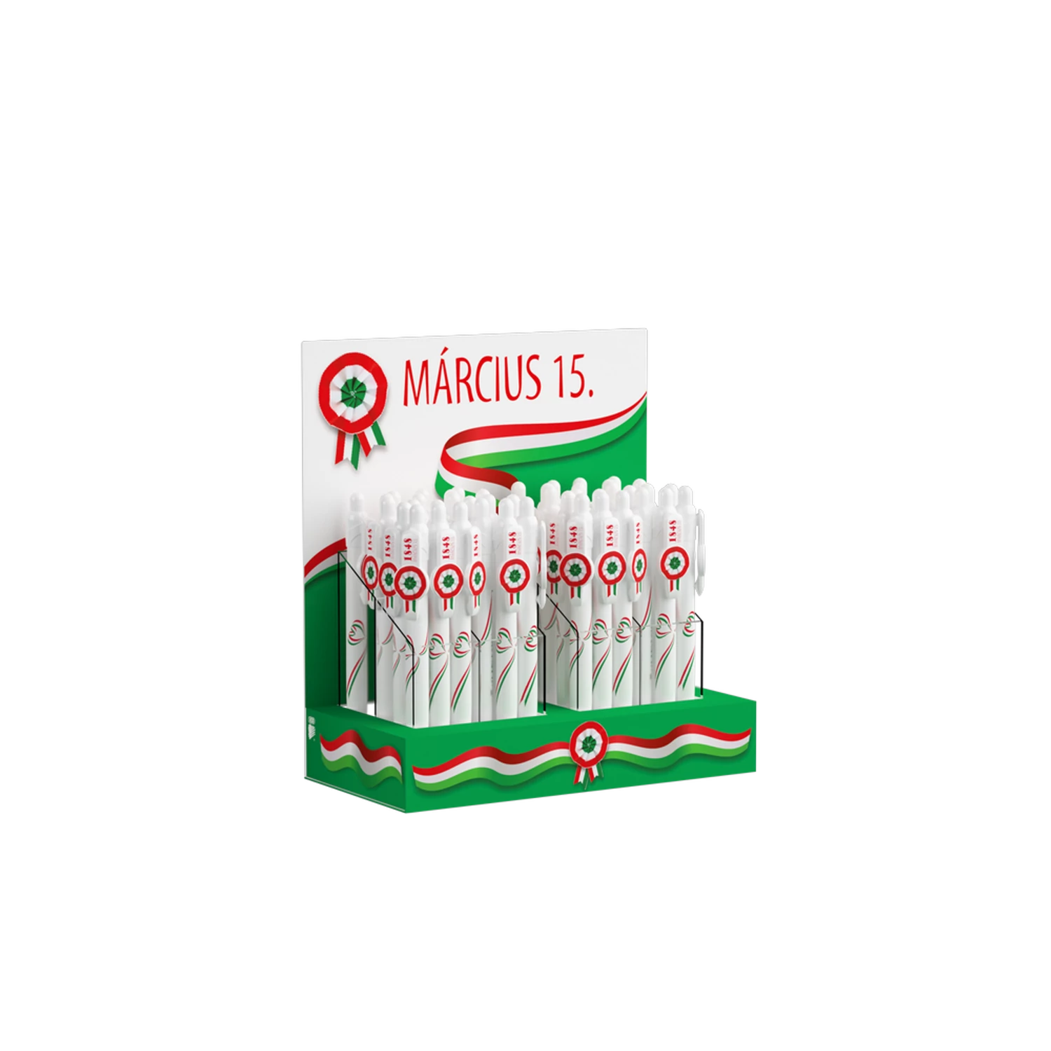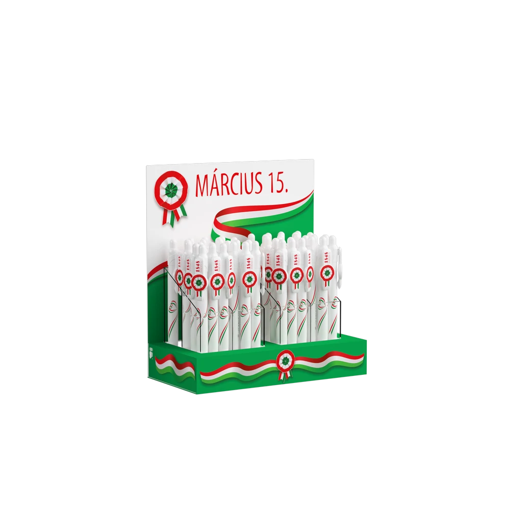 Magyar nemzeti motívumokkal díszített nyomógombos mechanikával működő golyóstoll 0,8 mm-es kék színű X-20as golyósbetéttel. Vonalvastagság: 0,8 mm. Íráshossz: 2500 m. 48 db/display Katalóguskód: 54794 Hiteles tájékoztatás: Elkötelezettek vagyunk termékeink biztonságának garantálásáért, nyomon követjük a termékbiztonsággal kapcsolatos valamennyi európai uniós és hazai szabályozást és biztosítjuk termékeink azoknak történő megfelelését. Az EU 2023/988-as számú Általános Termékbiztonsági Rendeletét (GPSR) is alkalmazzuk, így ha a termékeink biztonságát illetően fogyasztóként kérdése, észrevétele van, vagy esetleg balesetről van tudomása, kérjük, írja meg nekünk. GPSR: ICO ZRT