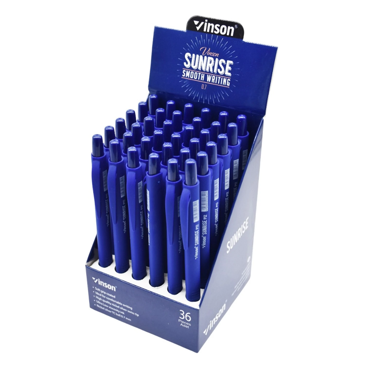 A Vinson Sunrise P12 nyomógombos golyóstoll a mindennapi írás egyik legkényelmesebb és leghatékonyabb eszköze, amely a letisztult forma és a precíz működés tökéletes harmóniáját kínálja. A 0,7 mm-es hegyvastagság ideális választás az átlagos irodai, iskolai és jegyzetelési feladatokhoz – elég vékony ahhoz, hogy pontos, mégis lendületes írásképet adjon. A Vinson Sunrise sorozat a megbízhatóság és az esztétikum kombinációja: ergonomikus kialakítása, kényelmes fogása és egyenletes tintafolyása miatt hosszabb írás során sem fárasztja a kezet. A 36 darabos display kiszerelés kifejezetten boltok, irodák, iskolák vagy irodaszerek viszonteladói számára készült, de nagyobb munkahelyi felhasználásra is praktikus megoldás.