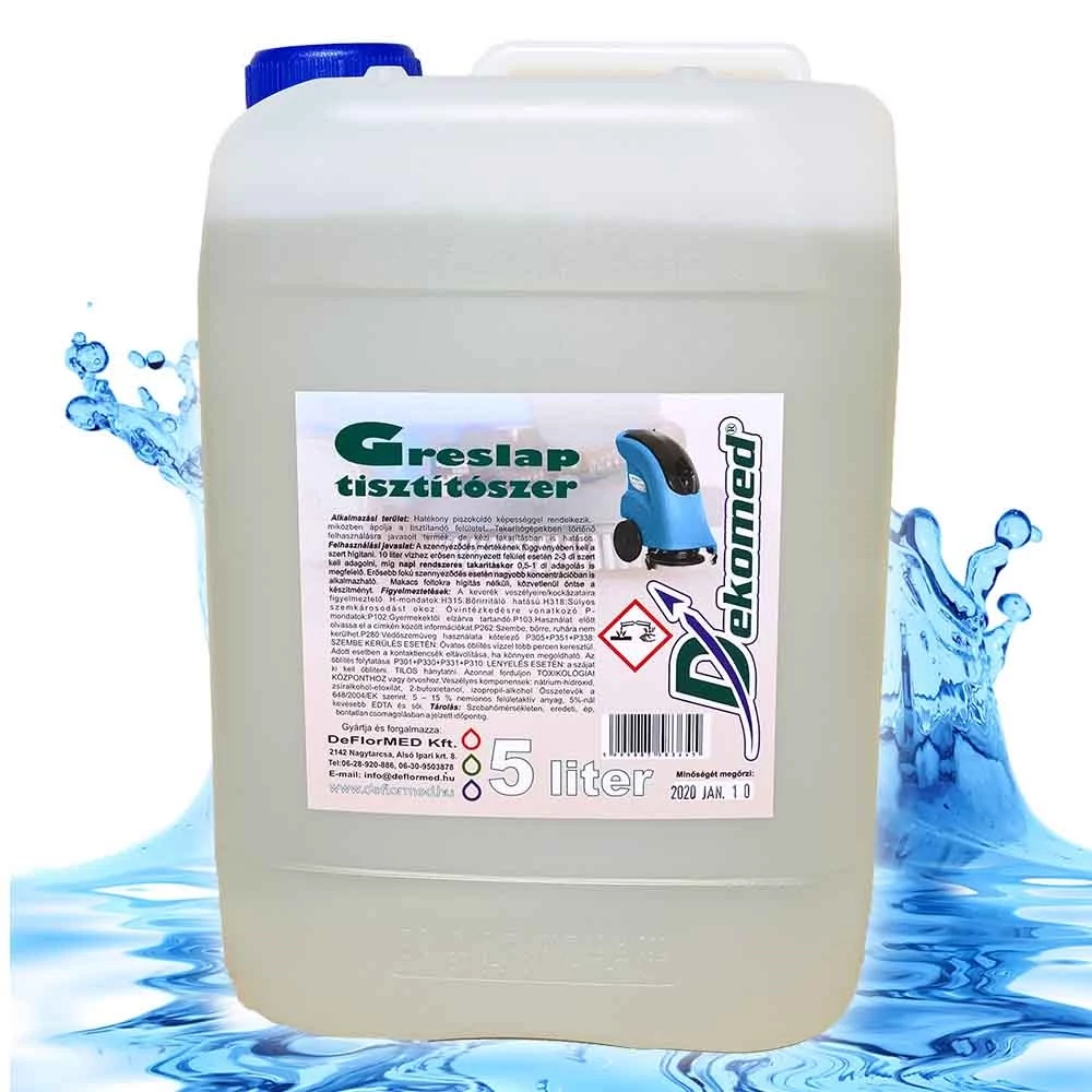 A Dekomed greslap tisztító folyékony, nagy piszokoldó hatású kézi és gépi tisztítószer. Nagyhatású piszokoldó képességgel rendelkezik, miközben ápolja a tisztítandó felületet. Takarítógépekben történő felhasználásra javasolt termék, de kézi takarításban is hatásos. Alkalmazási koncentráció: 10 liter vízhez erősen szennyezett felület esetén 2-3 dl szert kell adagolni, míg napi rendszeres takarításkor 0,5-1 dl adagolás is elégséges. Összetétel: 15-20 % nemionos felületaktív anyagok, < 5 % izopropil alkohol, <2 % komplex képző, < 2%, butil-diglikol, <2 % nátrium-hidroxid, illatanyag. Kiszerelés: 5 liter / kanna Greslaptisztító 5 kg Dekomed alkalmazásakor ügyeljen a biztonságra! Használat előtt mindig olvassa el a címkét és a használati útmutatót! Katalóguskód: 61482