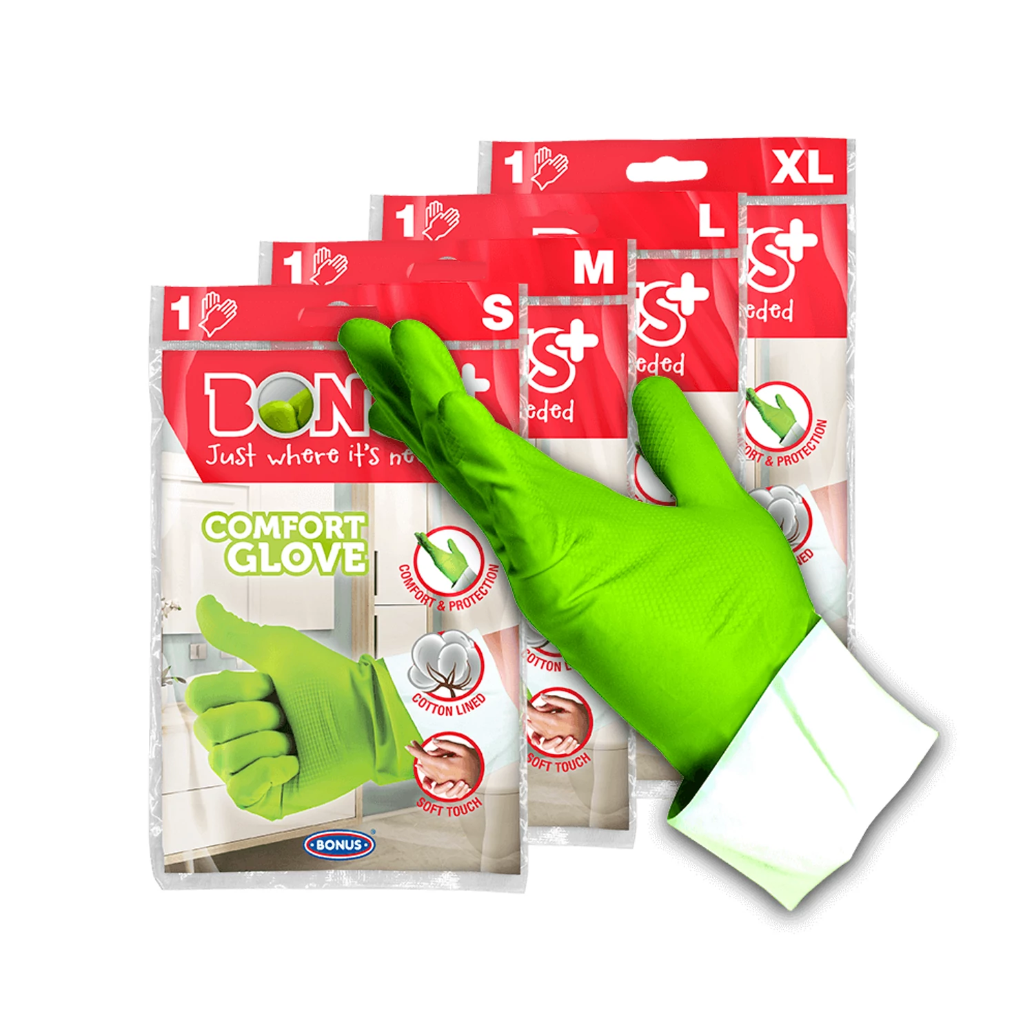 A Bonus+Komfort_B971 háztartási gumikesztyű L-es méretben egy olyan praktikus háztartási védőkesztyű, amely a mindennapi takarítási és mosogatási feladatok során kényelmesebb, biztonságosabb használatot adhat. A web24 termékoldala alapján ez egy zöld színű, pamutbéléses háztartási gumikesztyű pár, Bonus gyártótól. A leírás szerint kiváló minőségű, tartós gumiból készül, és L méretű, vagyis nagyobb kézméretre ajánlott kivitel.