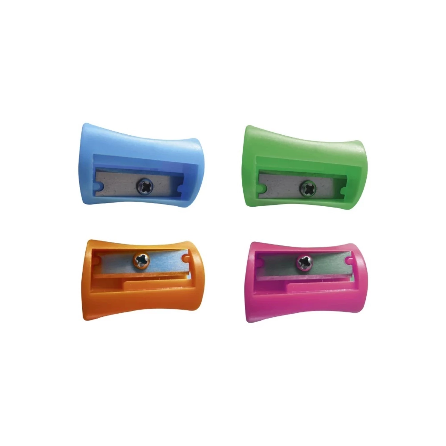 Hegyező műanyag 1 lyukú 36 db / bliszter PVC; 4 szín: narancs, kék, rózsaszín és zöld; műanyag dobozban