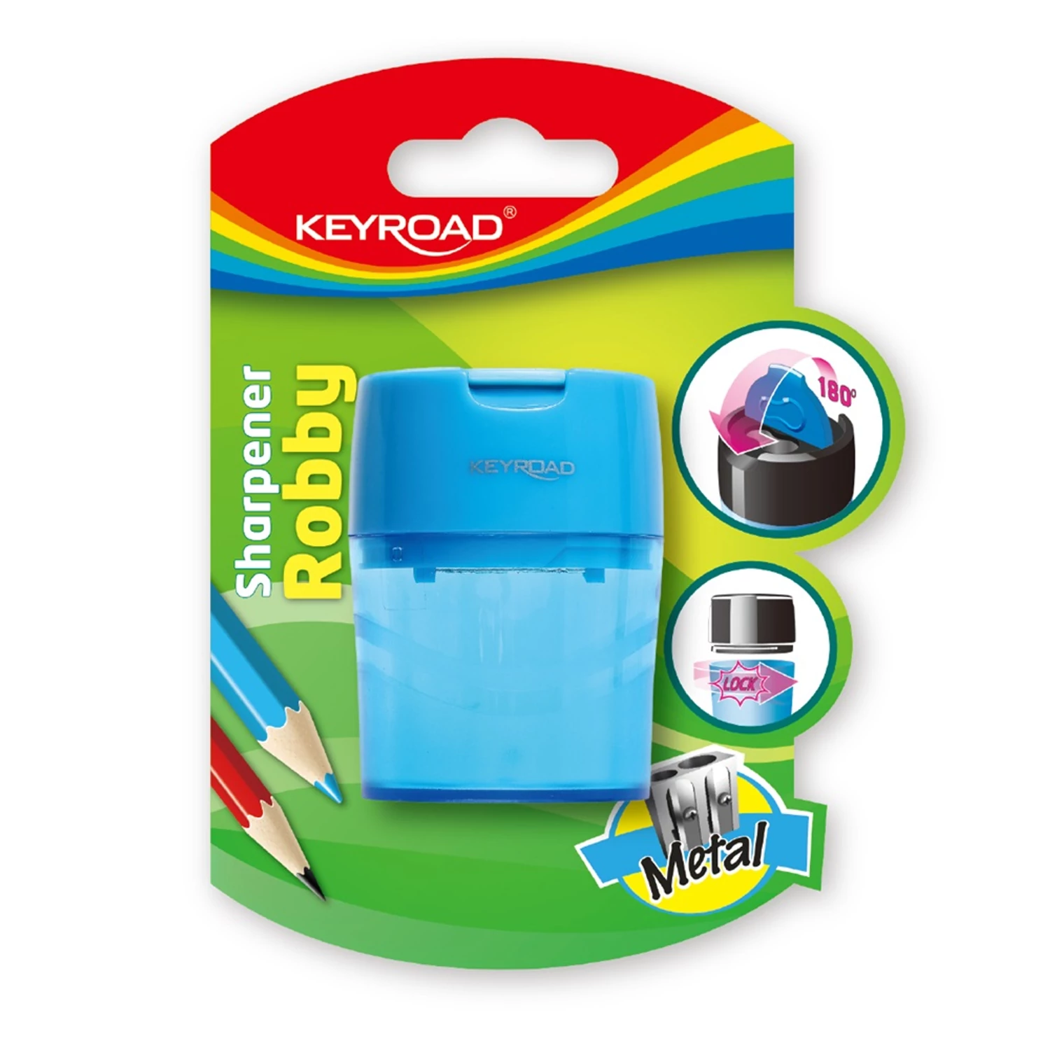 Hegyező 2 lyukú tartályos, fedeles, fém belsővel Keyroad Robby vegyes színek