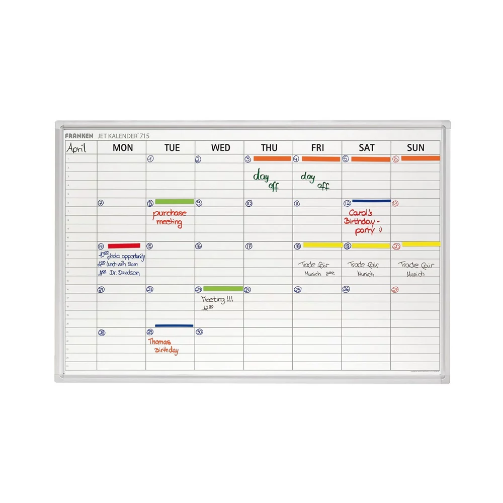 A heti terhelés és felelősség megosztása akkor átlátható, ha a csapat egy helyen, egy pillantással látja a feladatokat. A Franken JK715 60×90 cm-es, mágneses, szárazon törölhető heti tervezője pontosan ezt adja: strukturált Hétfő–Vasárnap bontást, jól követhető cellákat, és egy fehérboard minőségű felületet, amelyre a jelölések nyom nélkül törölhetők. A vékony, alumínium keret és a lekerekített sarokelemek professzionális megjelenést adnak, a táblát irodában, tárgyalóban, műszakirányítási ponton vagy oktatási térben is szívesen fogod használni.