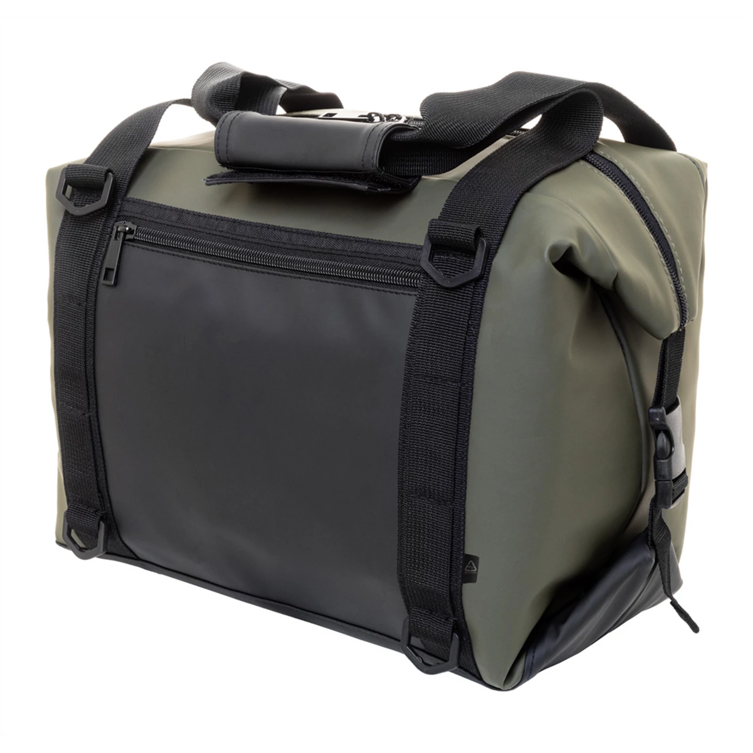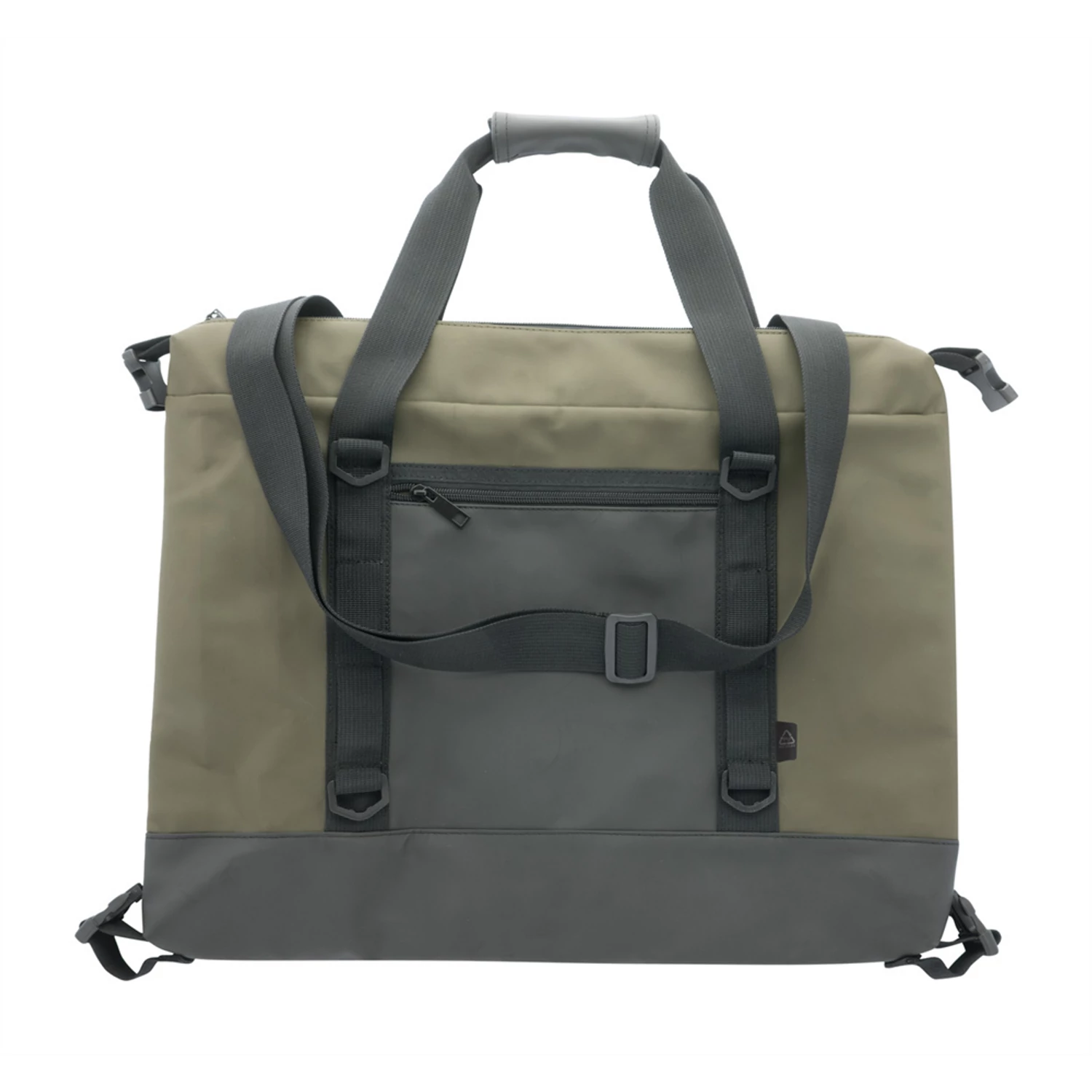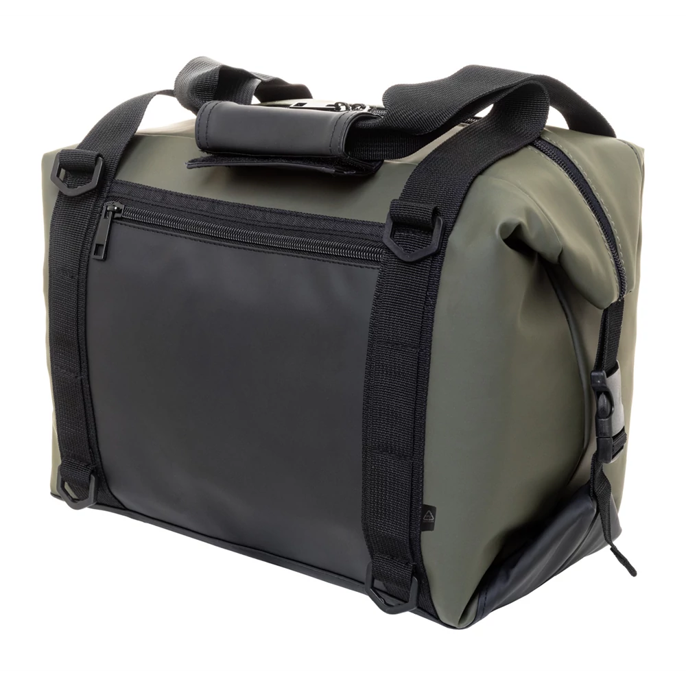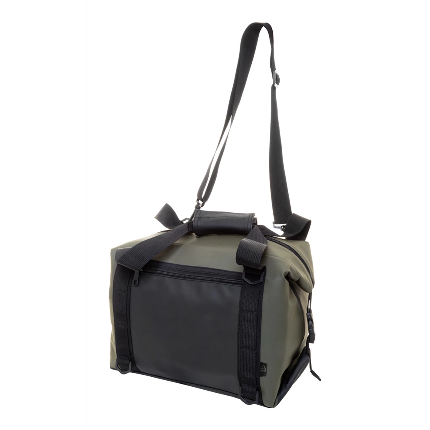 Cipzáras, összecsukható hűtőtáska puha újrahasznosított PU bőrből, alumínium béléssel és cipzáras első zsebbel. Oldalsó csatokkal, fogantyúkkal és állítható vállpánttal. A táska laposra hajtható a könnyebb tárolás érdekében, vagy használat közben az oldalsó csatokkal rögzíthető. Mérete: 270x220x220 mm Térfogat:19 liter Teherbírás: 8 kg Katalóguskód: 56992