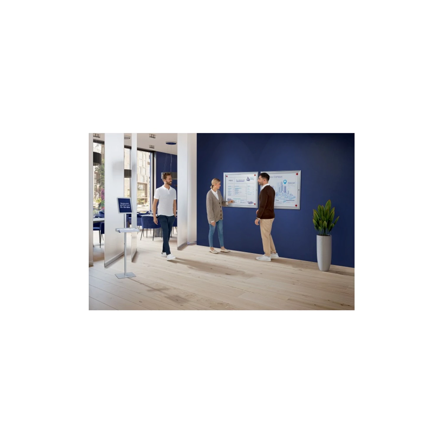 Univerzális ár- és információs állvány. Állítható magasság az A/4 esetében 86,5 és 125 cm, az A/3 esetében 91 és 131 cm között. Állítható fekvő vagy álló formátum, valamint változtatható dőlésszög. A billenő keretszerkezet lehetővé teszi az információs anyagok egyszerű és gyors cseréjét. A keret eloxált alumíniumból készült, dekoratív műanyag sarokelemekkel. Felülete UV-álló, tükröződésmentes fólia. 28 x 28 cm-es alu talp. Hiteles tájékoztatás: Elkötelezettek vagyunk termékeink biztonságának garantálásáért, nyomon követjük a termékbiztonsággal kapcsolatos valamennyi európai uniós és hazai szabályozást és biztosítjuk termékeink azoknak történő megfelelését. Az EU 2023/988-as számú Általános Termékbiztonsági Rendeletét (GPSR) is alkalmazzuk, így ha a termékeink biztonságát illetően fogyasztóként kérdése, észrevétele van, vagy esetleg balesetről van tudomása, kérjük, írja meg nekünk. GPSR: LEITZ ACCO Brands GmbH & Co KG