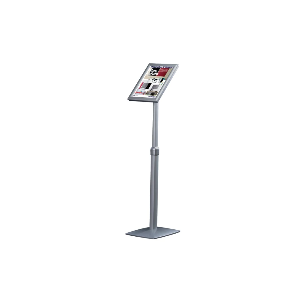 Univerzális ár- és információs állvány. Állítható magasság az A/4 esetében 86,5 és 125 cm, az A/3 esetében 91 és 131 cm között. Állítható fekvő vagy álló formátum, valamint változtatható dőlésszög. A billenő keretszerkezet lehetővé teszi az információs anyagok egyszerű és gyors cseréjét. A keret eloxált alumíniumból készült, dekoratív műanyag sarokelemekkel. Felülete UV-álló, tükröződésmentes fólia. 28 x 28 cm-es alu talp. Hiteles tájékoztatás: Elkötelezettek vagyunk termékeink biztonságának garantálásáért, nyomon követjük a termékbiztonsággal kapcsolatos valamennyi európai uniós és hazai szabályozást és biztosítjuk termékeink azoknak történő megfelelését. Az EU 2023/988-as számú Általános Termékbiztonsági Rendeletét (GPSR) is alkalmazzuk, így ha a termékeink biztonságát illetően fogyasztóként kérdése, észrevétele van, vagy esetleg balesetről van tudomása, kérjük, írja meg nekünk. GPSR: LEITZ ACCO Brands GmbH & Co KG