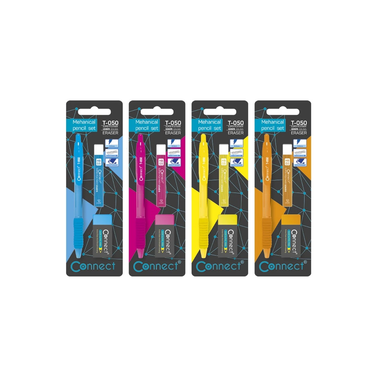A Connect írószer szett egy praktikus, mindennapi használatra összeállított csomag, amelyben egy 0,5 mm-es nyomósirón (mechanikus ceruza), hozzá való HB grafitbél és egy radír kapott helyet. Mindez bliszteres kiszerelésben, különböző színű nyomósirónnal, így nemcsak funkcióban, hanem megjelenésben is feldobja a tolltartót vagy az íróasztalt.
