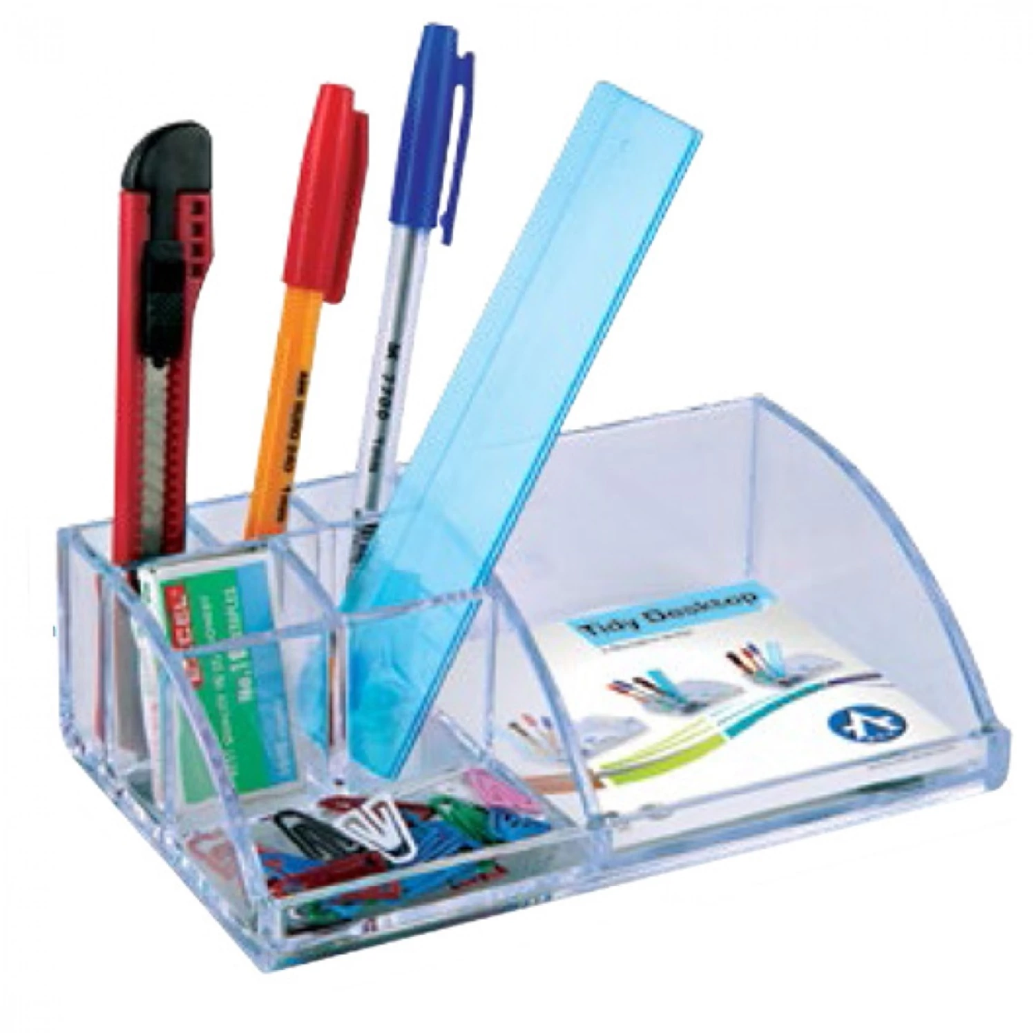Kiváló minőségű víztiszta asztali írószertartó, rendező. Ideális az irodába vagy otthonra is. Jegyzettömbtartó, gemkapocstartó és 5 kisebb rekesz a ceruzáknak, tollaknak, vonalzónak, stb. Tartozékok nélkül szállítjuk. Méret: 180x110x55mm Katalóguskód: 981