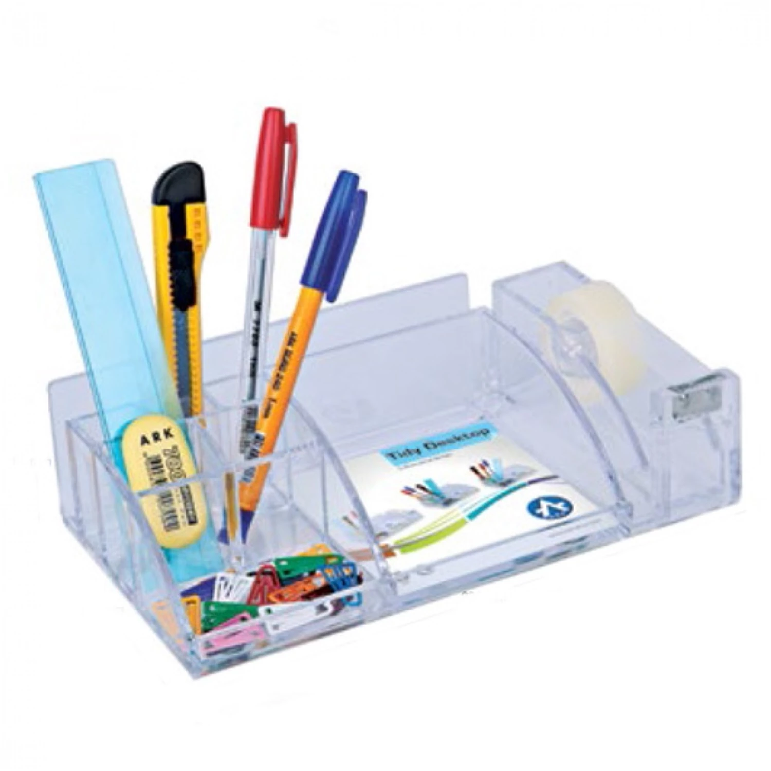 Kiváló minőségű víztiszta asztali írószertartó, rendező. Ideális az irodába vagy otthonra is. Jegyzettömbtartó, gemkapocstartó, levéltartó, 5 kisebb rekesz a ceruzáknak, tollaknak, vonalzónak, stb. Jobb oldalán könnyen használható cellux adagolóval. Egyéb tartozékok nélkül szállítjuk. Méret: 230x125x65mm Katalóguskód: 980 A termék irodai felhasználásra készült.