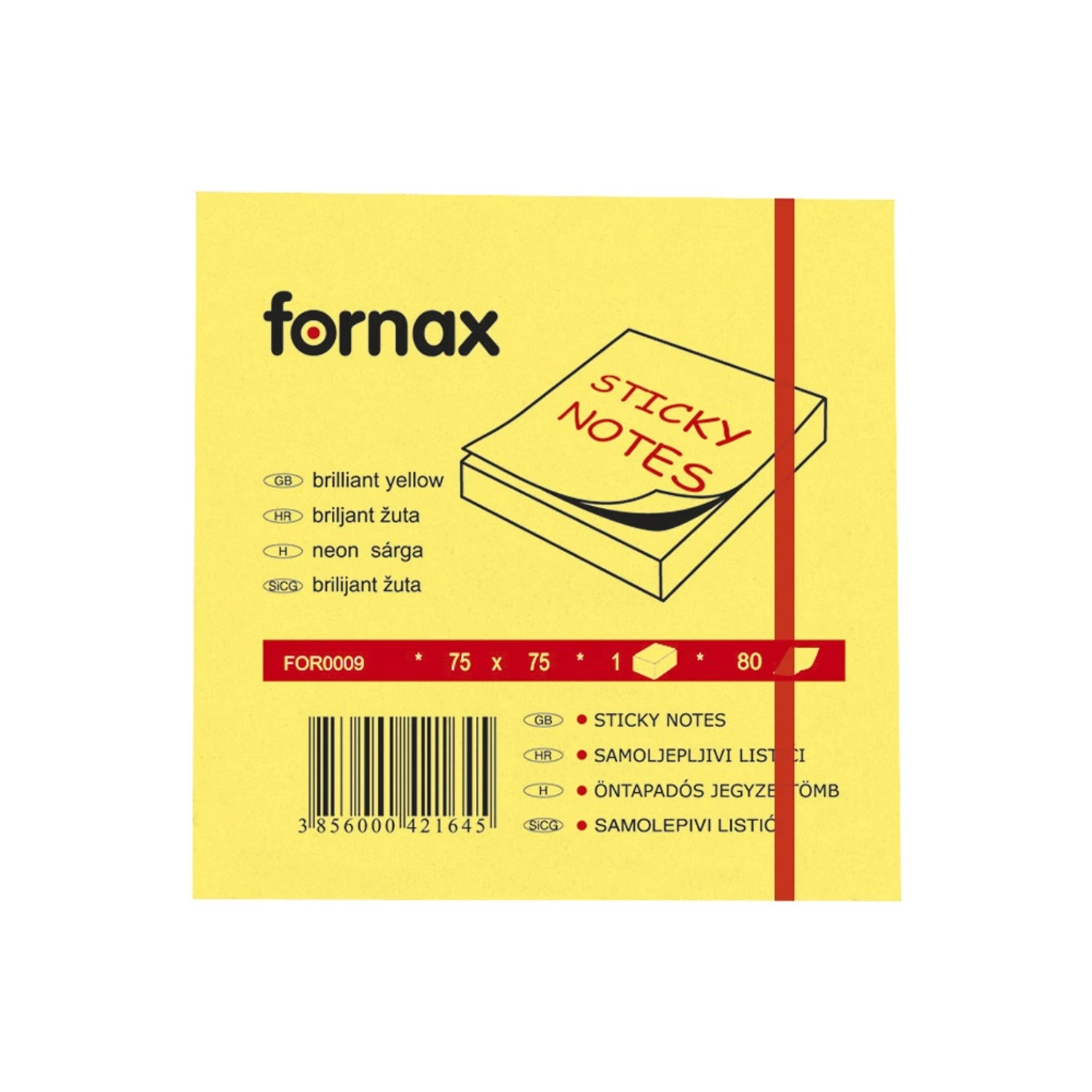 Jegyzettömb öntapadó, 75x75mm, 80lap, Fornax neon sárga