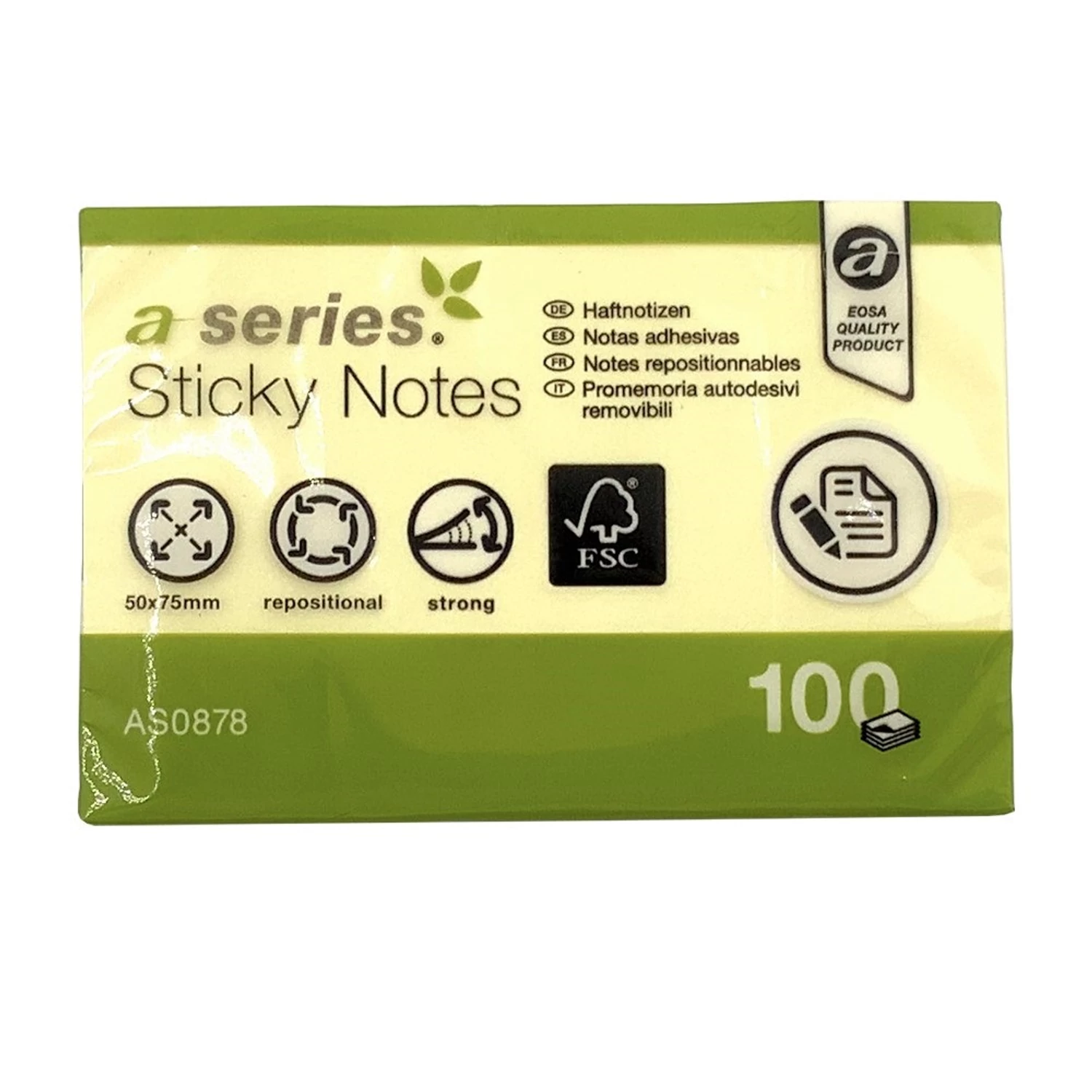 Az A-Series öntapadó jegyzettömb 100 lapot tartalmaz, amelyek egységes 50×75 mm-es méretűek. A papír felülete alkalmas tollal és ceruzával történő írásra, a jegyzetek jól olvashatók és rendezettek maradnak. Az öntapadó csík megfelelő tapadást biztosít ahhoz, hogy a lap a helyén maradjon, ugyanakkor nem rongálja a felületet eltávolításkor.