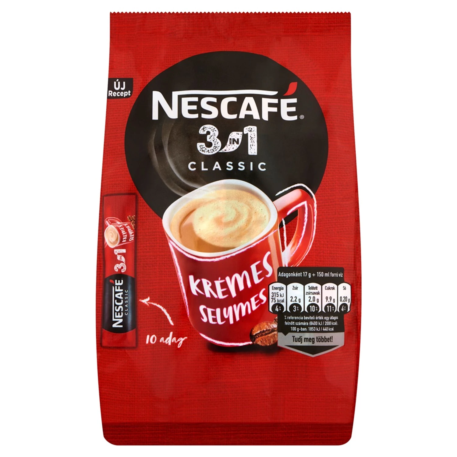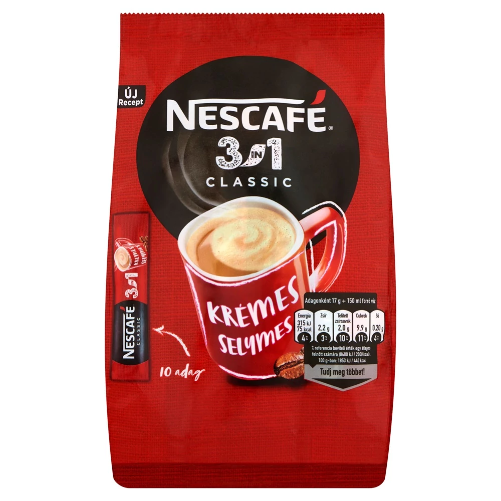 Azonnal oldódó kávéspecialitás Megújult csomagolóanyag Újrahasznosíthatóságra tervezve** Élvezd otthon, munkában, vagy akár a barátaiddal a jól ismert Nescafé 3in1 Classicot, melynek minden egyes csészéje krémes és selymes ízélményt nyújt! **A Nescafé csomagolások újrahasznosíthatóságával kapcsolatos további részletek elérhetőek a www.nescafé.hu weboldalon. Cup of Respect Egy csésze megbecsülés A Nescafé® 2010 óta világszerte már több, mint 235 millió kávépalántát juttatott el farmereknek azzal a céllal, hogy fejlessze a kávétermesztés fenntarthatóságát és a felhasznált kávébabok minőségét. Katalóguskód: 47367 Hiteles tájékoztatás: Elkötelezettek vagyunk termékeink biztonságának garantálásáért, nyomon követjük a termékbiztonsággal kapcsolatos valamennyi európai uniós és hazai szabályozást és biztosítjuk termékeink azoknak történő megfelelését. Az EU 2023/988-as számú Általános Termékbiztonsági Rendeletét (GPSR) is alkalmazzuk, így ha a termékeink biztonságát illetően fogyasztóként kérdése, észrevétele van, vagy esetleg balesetről van tudomása, kérjük, írja meg nekünk.