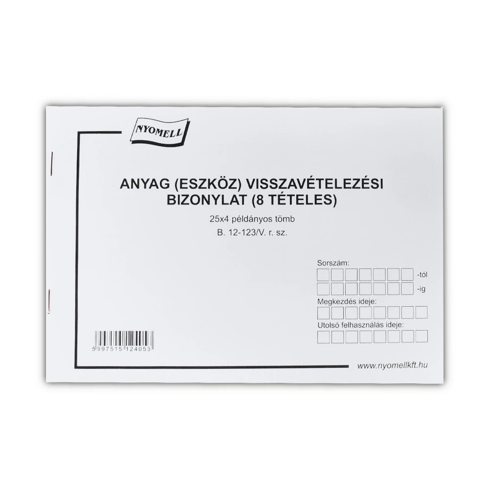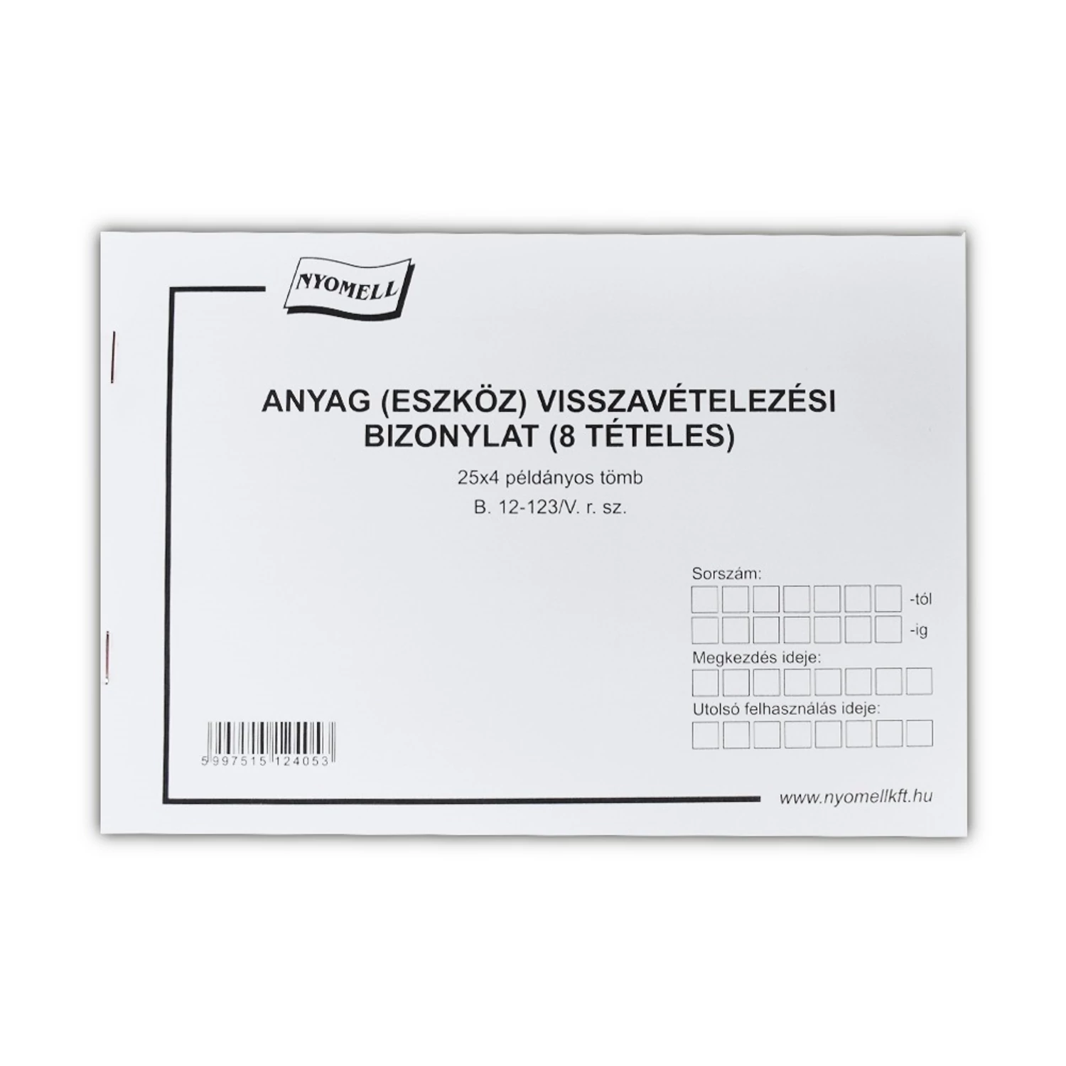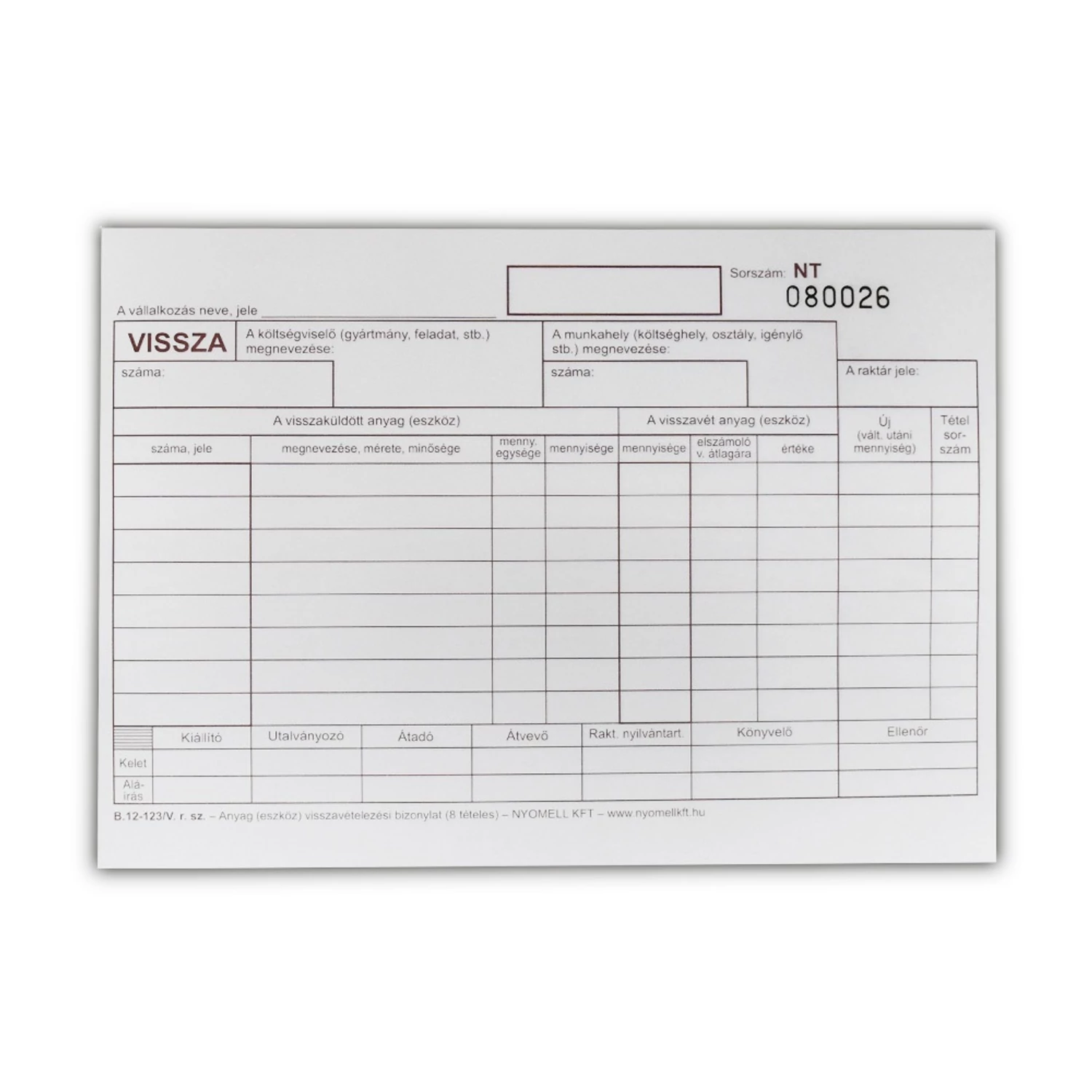 - Szabványnak megfelelő jelölés (B.12-123/V kód) – hivatalos, jól beazonosítható típus, amit sok vállalati és intézményi bizonylati szabályzat elfogad. (Lásd raktári és anyag-gazdálkodási szabályzatokban is „Készlet visszavételezési bizonylat” szerepel.