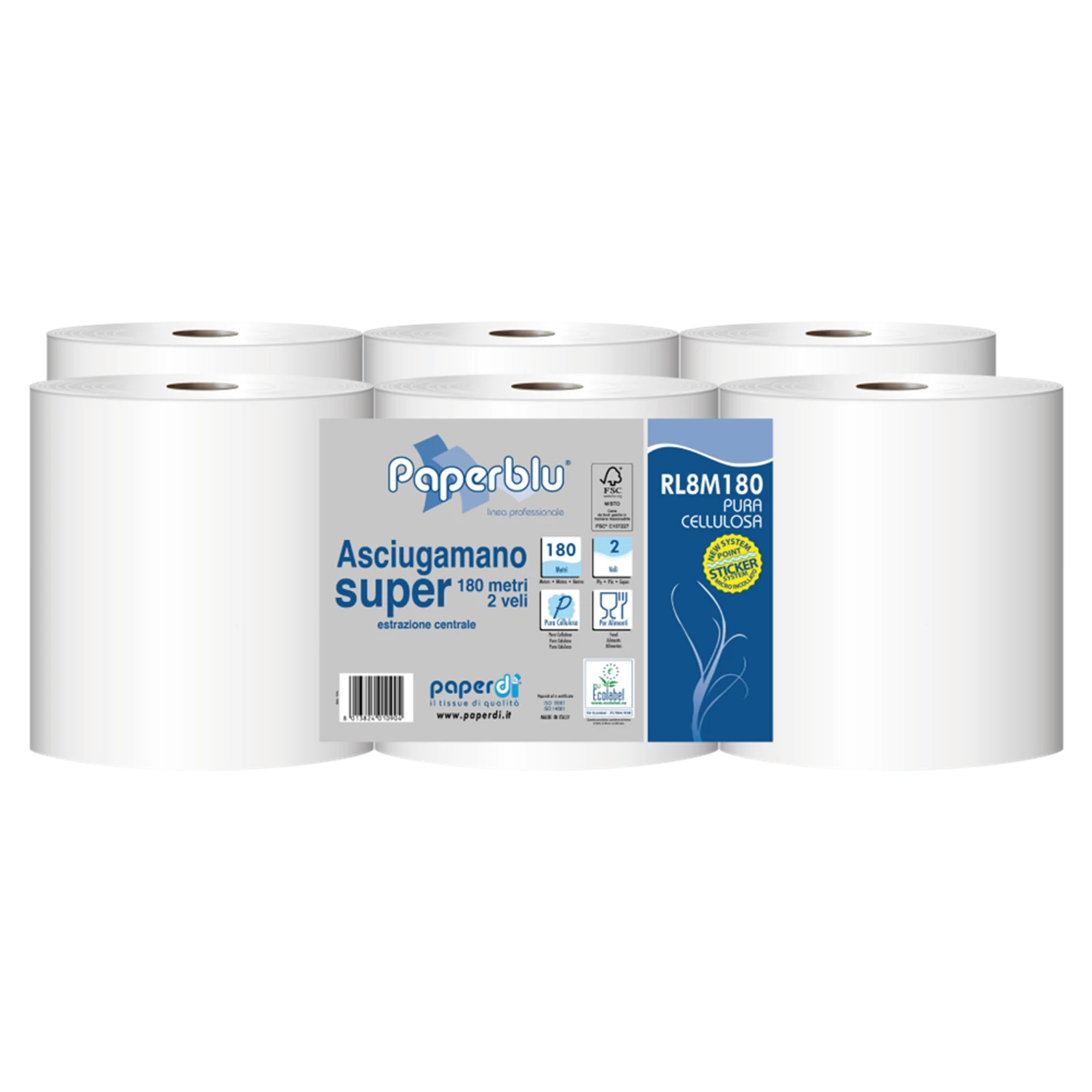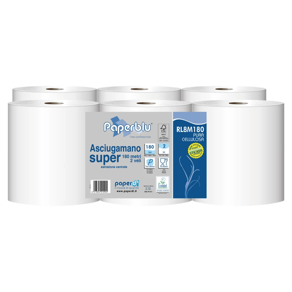 Kéztörlő 2 rétegű tekercses átmérő: 20 cm 100% cellulóz 486 lap/180 m/tekercs 6 tekercs/csomag Paperdi_RL8M180 fehér