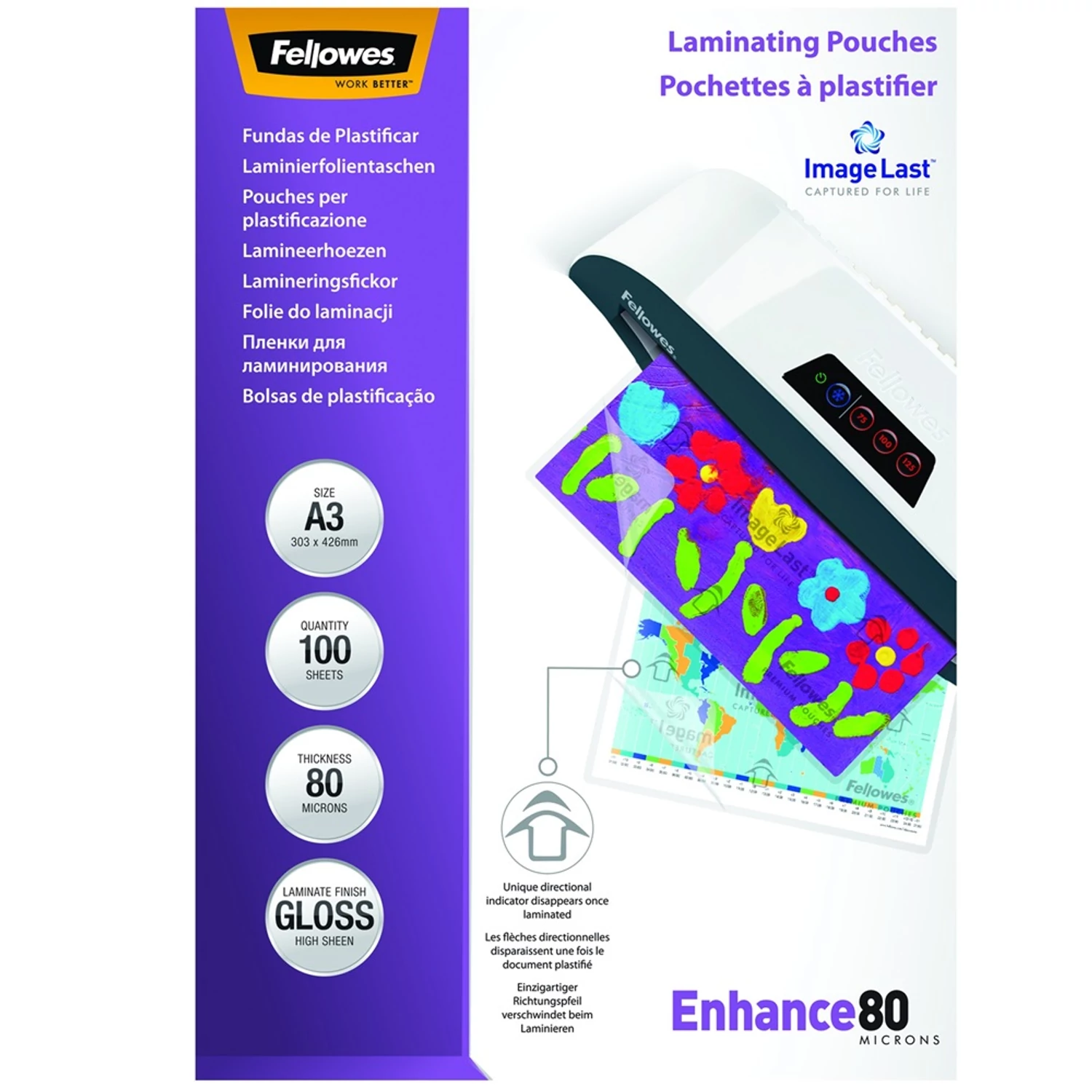 Lamináló fólia, A3, 80 mikron, fényes, 100 db/doboz, Fellowes®