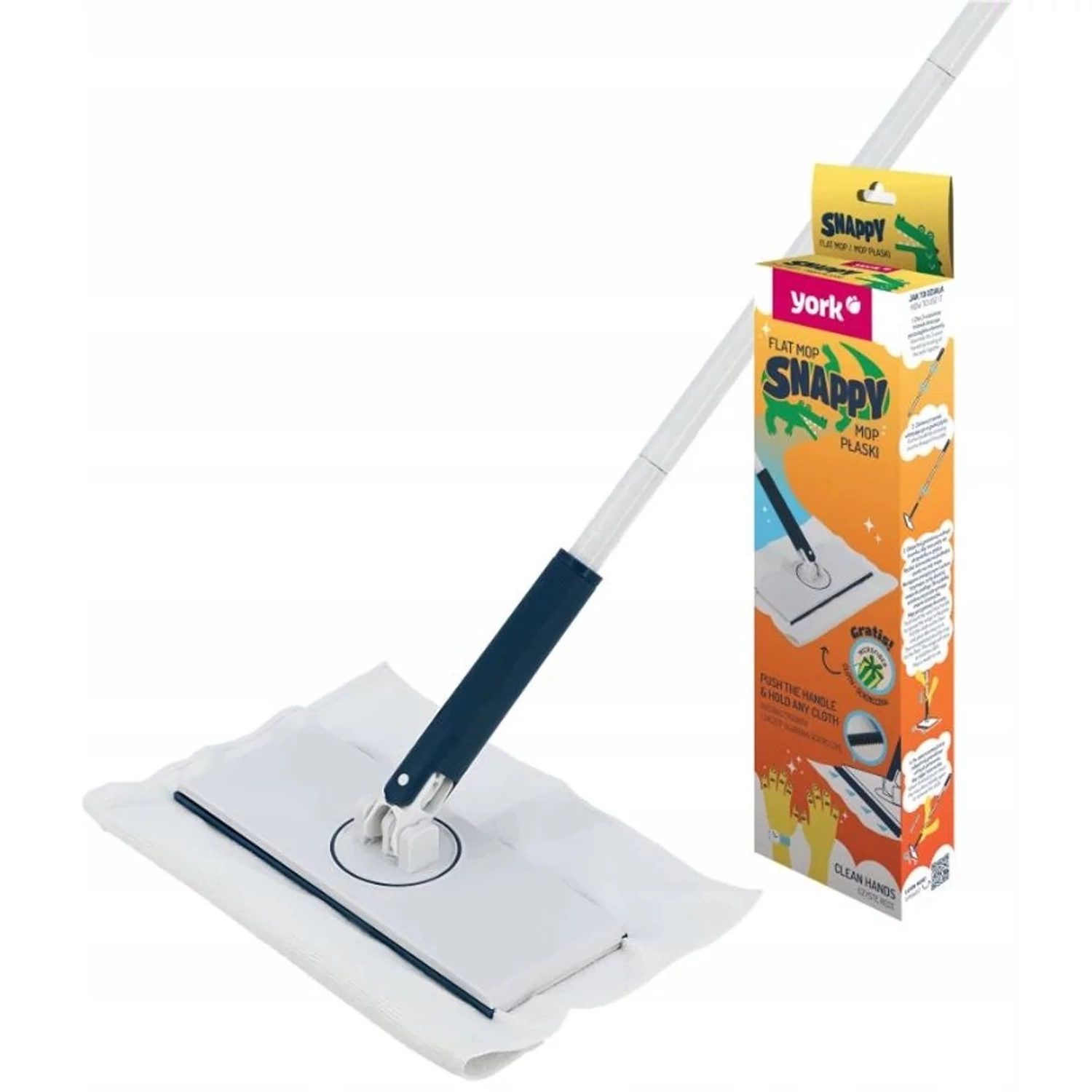 York Snappy lapos felmosó sokoldalú eszköz bármilyen felület tisztítására. Az univerzális felmosó 360°-ban elforgatható fejjel van felszerelve. A mozgatható fejre könnyedén felhelyezhet bármilyen típusú ruhát, száraz és eldobható nedves törlőkendőket egyaránt. A könnyű, lapos felmosó könnyen befér a bútorok alá, és összegyűjti a port a sarkokból és a szűk résekből. mérete: 25 x 9,5 cm hossza: 126 cm Katalóguskód: 63327