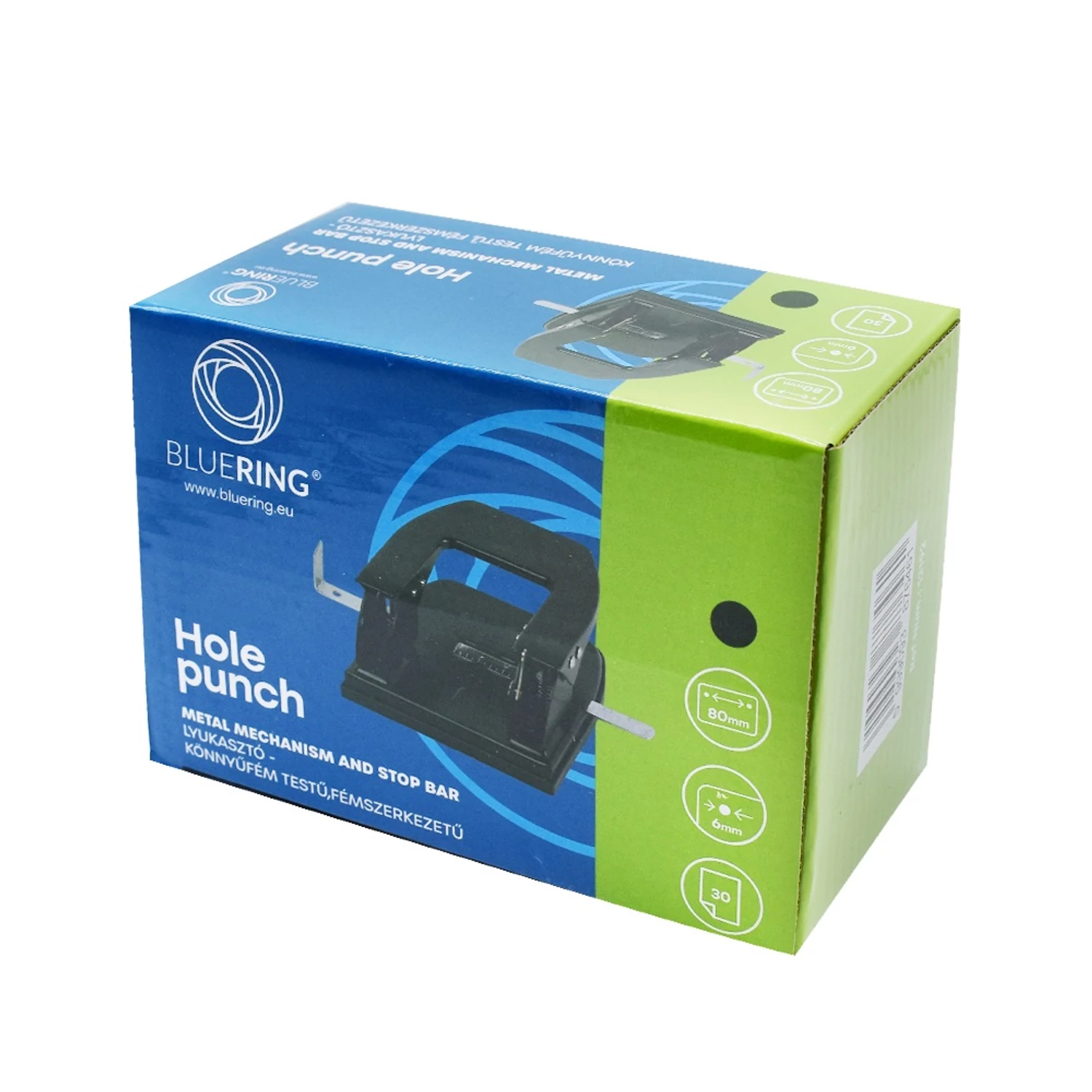 Könnyűfém testű, fémszerkezetű lyukasztógép, ütköztetőléccel. Állítható a távtartósín, hulladéktárolóval. ABS műanyag elemekkel. Lyuktávolság: 80mm. Egyszerre lyukasztható lapok száma: 30 lap Katalóguskód: 12192