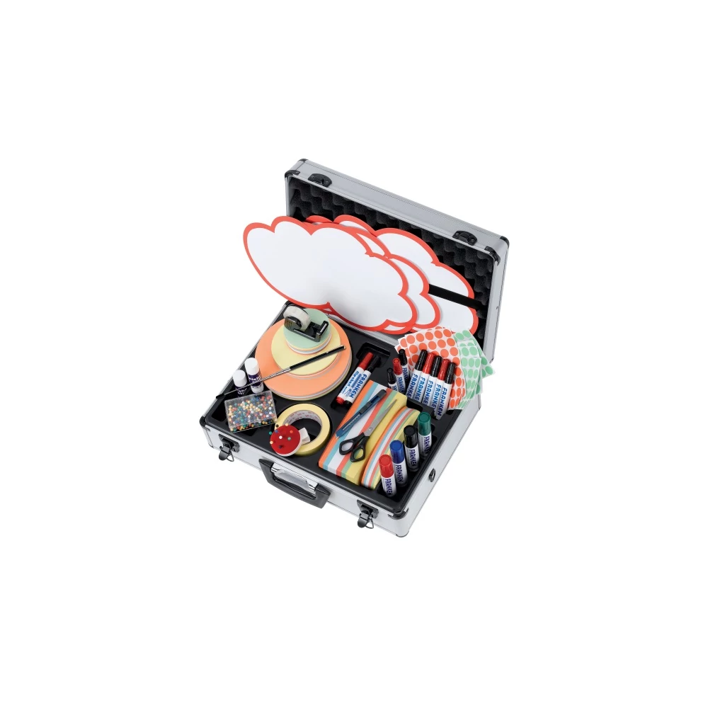 Zárható, robusztus alumínium bőrönd. Súly a tartozékokkal együtt: kb. 6 kg. A bőrönd levehető hordszíjat és tartozékok széles választékát tartalmazza: 5 db. moderációs felhők 25 x 42 cm 500 db. moderációs kártyák téglalapok 20,5 x 9,5 cm, 6 színben válogatott 200 db. moderációs kártya ovális 19 x 11 cm, 6 színben válogatott 200 db. moderációs kártyák ? 9,5 cm, 6 színben válogatott 150 db. moderációs kártyák ? 14 cm, 6 színben válogatott 150 db. moderációs kártyák ? 19,5 cm, 6 színben válogatott 520 darab egyenként piros és zöld jelölőpontok 10 flipchart jelölő (6x fekete, 4x piros) 4 jumbo marker (piros, zöld, kék, fekete) 1 db Papírolló, ragasztó fólia adagolóval, maszkoló szalag, 2 ragasztórúd, tűpárna, vágó, lézermutató 300 tűs kerek fejjel Méret SZxMxM: 48 x 16 x 37 cm. Hiteles tájékoztatás: Elkötelezettek vagyunk termékeink biztonságának garantálásáért, nyomon követjük a termékbiztonsággal kapcsolatos valamennyi európai uniós és hazai szabályozást és biztosítjuk termékeink azoknak történő megfelelését. Az EU 2023/988-as számú Általános Termékbiztonsági Rendeletét (GPSR) is alkalmazzuk, így ha a termékeink biztonságát illetően fogyasztóként kérdése, észrevétele van, vagy esetleg balesetről van tudomása, kérjük, írja meg nekünk. GPSR: LEITZ ACCO Brands GmbH & Co KG