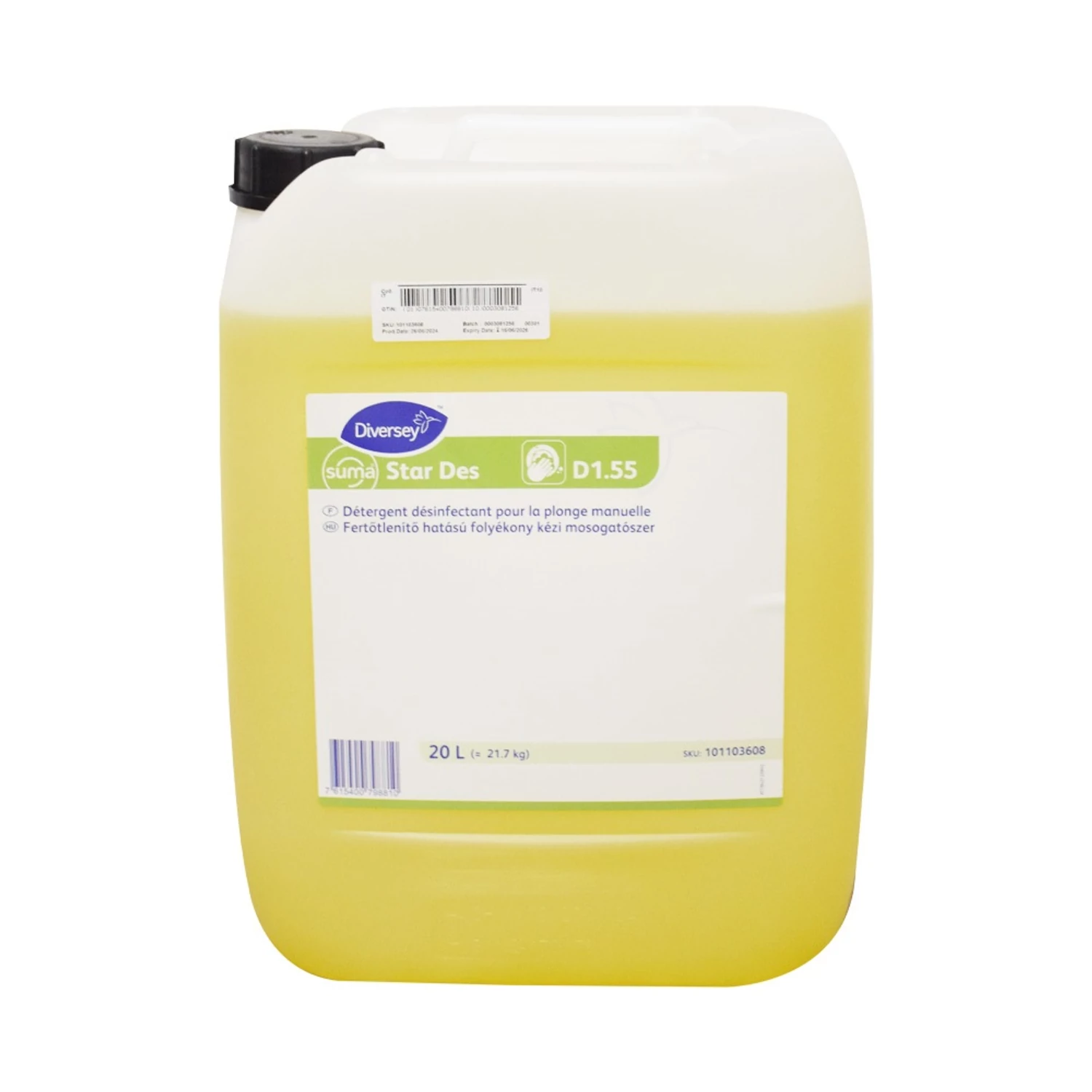 A Diversey Suma Star Des D1.55 az élelmiszeripar és vendéglátóipar minden területén használható, berendezések és eszközök tisztítására, fertőtlenítésére és kombinált kézi mosogatásra. A Suma Star Des D1.55 folyékony fertőtlenítő tisztítószer koncentrátum, mely bármilyen felületet egy lépésben tisztít és fertőtlenít. A termék minden edény és eszköz fertőtlenítő hatású kézi mosogatására alkalmas, valamint alkalmazható élelmiszertároló helyiségekben történő felülettisztításra is. GHS piktogram: Figyelmeztetés: Veszély Figyelmeztető mondatok: H290 Fémekre korrozív hatású lehet, H315 Bőrirritáló hatású, H318 Súlyos szemkárosodást okoz, H412 Ártalmas a vízi élővilágra, hosszan tartó károsodást okoz Kiszerelés: 20 liter / kanna Mosogató és tisztítószer egyben kézi 20 liter Suma Star Des D1.55 termék alkalmazásakor ügyeljen a biztonságra! Használat előtt mindig olvassa el a címkét és a használati útmutatót! Katalóguskód: 59202