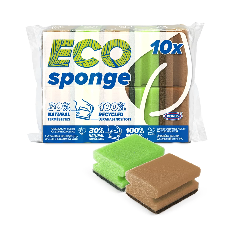 A BONUS ECO Formázott mosogatószivacs nem ismer lehetetlent, ha kíméletesen hatékony takarításról van szó. Hatékonyság és gondoskodás, a BONUS ECO formázott mosogatószivacs mindkettőben brillírozik. Karcmentes dörzsi rétegének hála gondoskodó határozottsággal vághatunk bele akár a nagytakarításba is. A szivaccsal a háztartási műveletek végtelen tárházát fedhetjük le: a mosogatáson túl akár a csempét is tisztára moshatjuk, de nem okoz gondot vele a vízkő eltávolítása, a függönykarnis légypiszkoktól történő mentesítése vagy akár a grillrácsra égett szennyeződés fellazítása sem. A tökéletes takarítási eredmény szempontjából nem mindegy az sem, hogy a szivacs mennyire áll kézre. Oldalain a kényelmes fogás érdekében vájatokat helyeztünk el, ezáltal a takarítás komfortos és kényelmes élmény lesz. A 10 darabos kiszerelésű BONUS formázott mosogatószivacs igazán gazdaságos, így egyetlen csomaggal akár az egész háztartás igényét kielégíthetjük. Szivacsrétege 30%-ban természetes anyagból készült, míg dörzsi rétege 100%-ban újrahasznosított anyagból, így kímélve a környezetet. A BONUS formázott mosogatószivacsunk 100 %-ban magyar gyártású termék, melyet használat után alaposan kiöblítve érdemes száraz helyen tárolni, hogy megőrizzük élettartamát és frissességét. 10 db / csomag Katalóguskód: 44283 Hiteles tájékoztatás: Elkötelezettek vagyunk termékeink biztonságának garantálásáért, nyomon követjük a termékbiztonsággal kapcsolatos valamennyi európai uniós és hazai szabályozást és biztosítjuk termékeink azoknak történő megfelelését. Az EU 2023/988-as számú Általános Termékbiztonsági Rendeletét (GPSR) is alkalmazzuk, így ha a termékeink biztonságát illetően fogyasztóként kérdése, észrevétele van, vagy esetleg balesetről van tudomása, kérjük, írja meg nekünk. GPSR: Bonus Kft. 7800 Siklós, Ipartelepi út 2., info@bonus-hungary.com, https://bonustakaritoeszkozok.hu