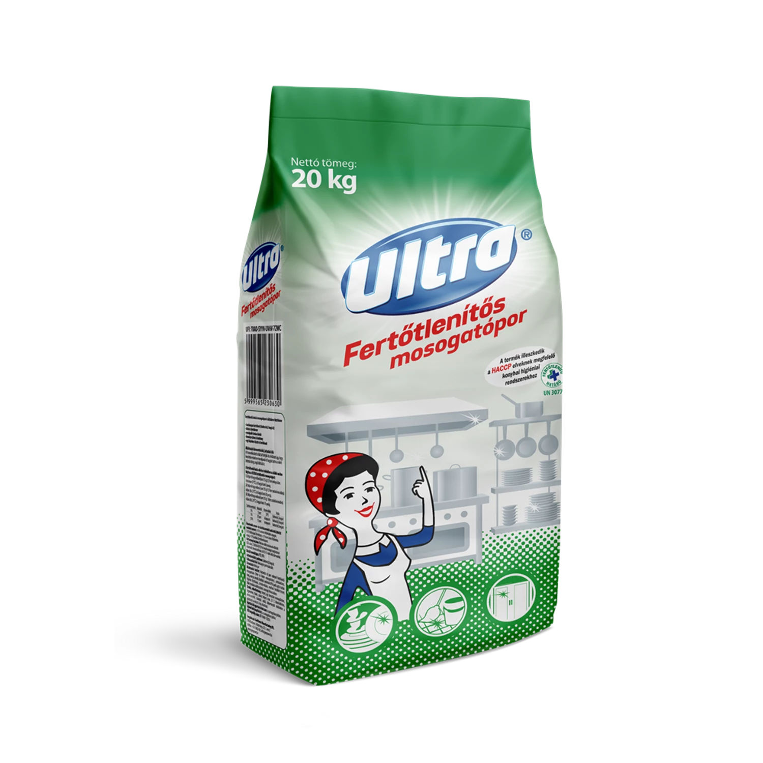Az Ultra általános mosogató- és tisztítószer kiválóan alkalmas háztartási és ipari edények mosogatására; üveg, csempe, mosdó, fürdőkád, kerámia és PVC padló, ajtó- és ablak tisztítására; zsírtalanításra; mosható festékkel festett fal tisztítására. Rendkívül gazdaságos, hidegen granulált, vízben jól oldódó mosogató- és tisztítószer. Kitűnő zsíroldószer. Emulgeáló hatása kiváló. Kemény vízben is rendkívül hatékony. Adagolás: A termék illeszkedik a HACCP elveknek megfelelő konyhai higiéniai rendszerekhez. Antimikrobiális spektrum: baktericid, fungicid Alkalmazási koncentráció, behatási idő: Szavatossági idő: 24 hónap ADR kód: UN3077