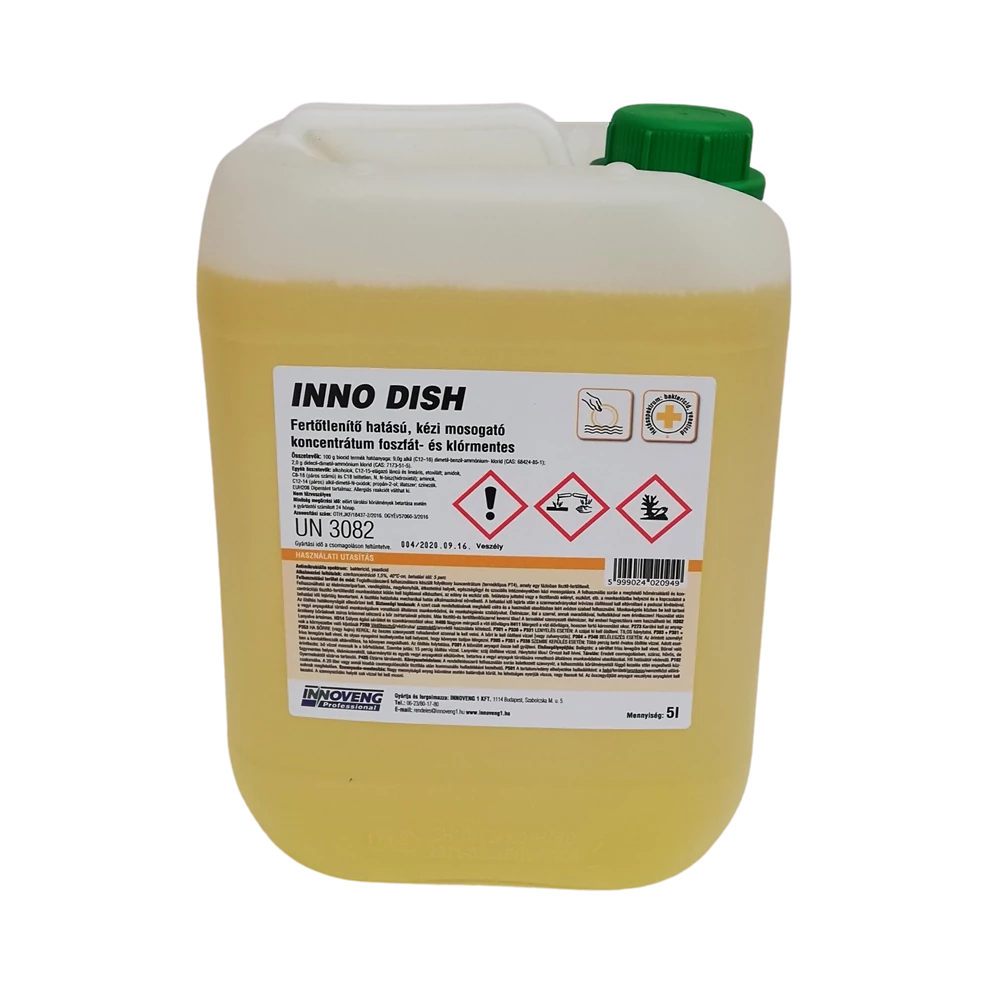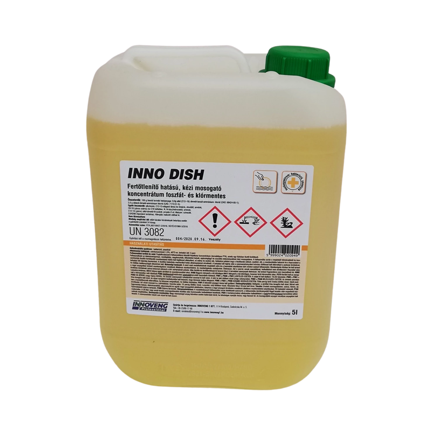 Foglalkozásszerű felhasználásra készült fertőtlenítő hatású, kézi mosogató és fertőtlenítőszer koncentrátum (terméktípus PT4), amely egy fázisban tisztít-fertőtlenít. Felhasználható az élelmiszeriparban, vendéglátás, nagykonyhák, étkeztetési helyek, egészségügyi és szociális intézményekben kézi mosogatásra. GHS piktogram: Figyelmeztetés: Veszély Figyelmeztető mondatok: Alkalmazás: A felhasználás során a megfelelő hőmérsékletű és koncentrációjú tisztító-fertőtlenítő munkaoldatot külön kell hígítással elkészíteni, az edény és eszköz stb. felületére juttatni vagy a tisztítandó edényt, eszközt, stb. a munkaoldatba helyezni és a kapcsolatot a behatási idő lejártáig fenntartani. A tisztítás hatásfoka mechanikai hatás alkalmazásával növelhető. Kiszerelés: 5 literes kanna Szavatossági idő: 24 hónap A Mosogatószer 5 liter kézi fertőtlenítő hatással Inno-Dish termék alkalmazásakor ügyeljen a biztonságra! Használat előtt mindig olvassa el a címkét és a használati útmutatót! Katalóguskód: 42177